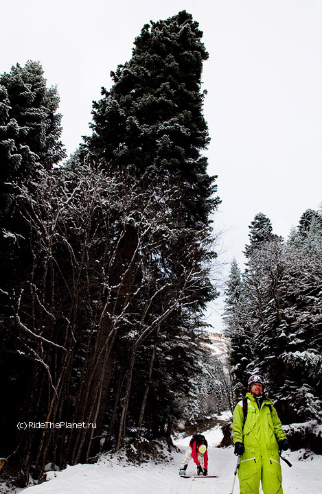 Сегодня был первый день с нормальной видимостью — так что сделали несколько картинок. Облака развеялись и удалось заглянуть сверху в Гоначхир — манящий спуск, осталось только договориться с лесниками о цене вопроса...:) Гоначхирское ущелье — заповедник, поэтому получается, что фрирайдеров там вполне законно штрафовать... Кстати, таблички «Тебердинский заповедник» появились и в лесу у Русской поляны, а в ущелье Алибек теперь вообще не зайти без пропуска в погранзону.