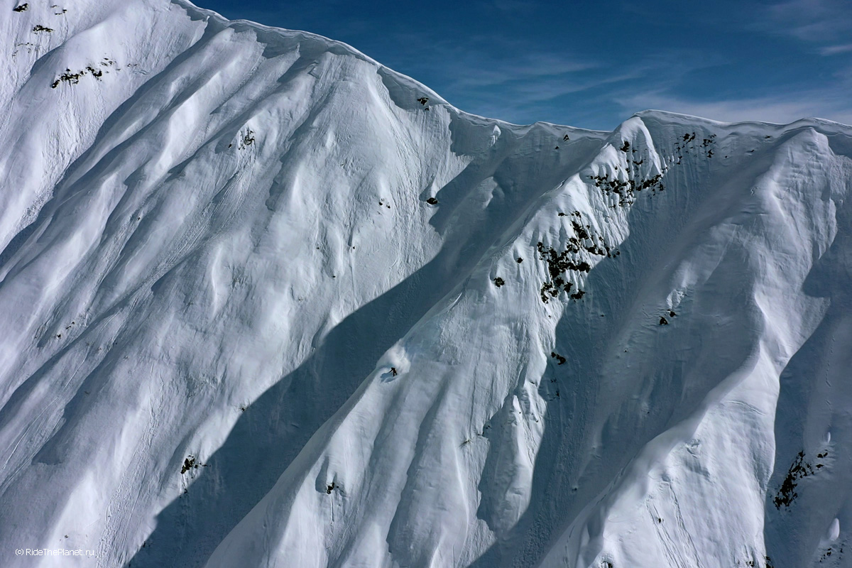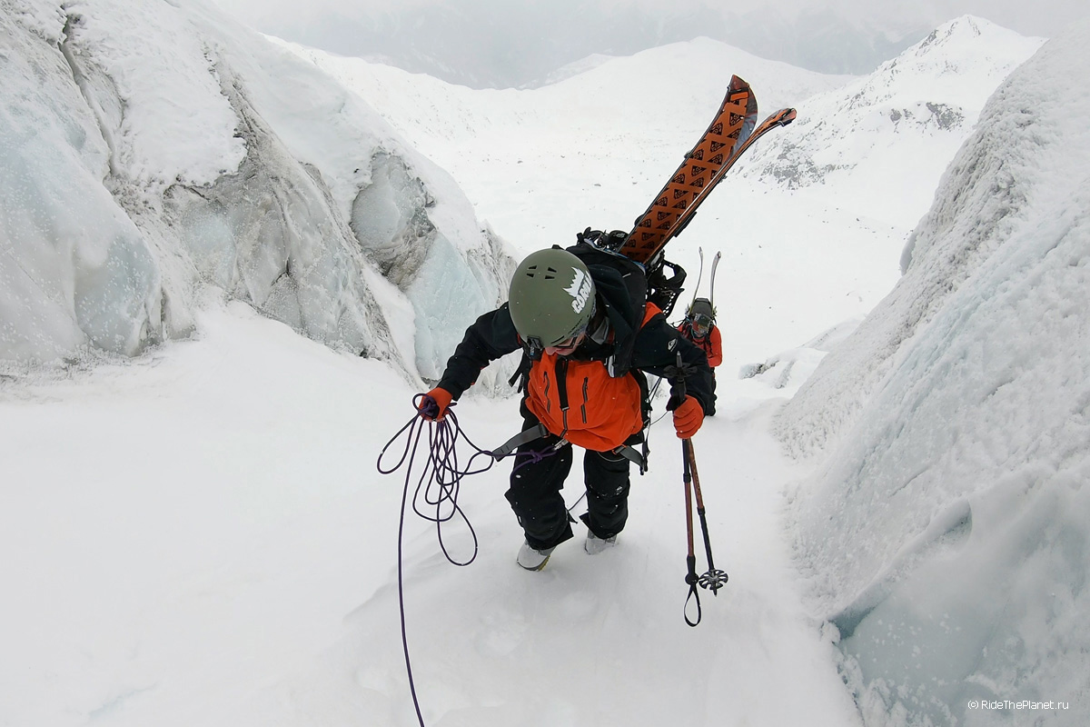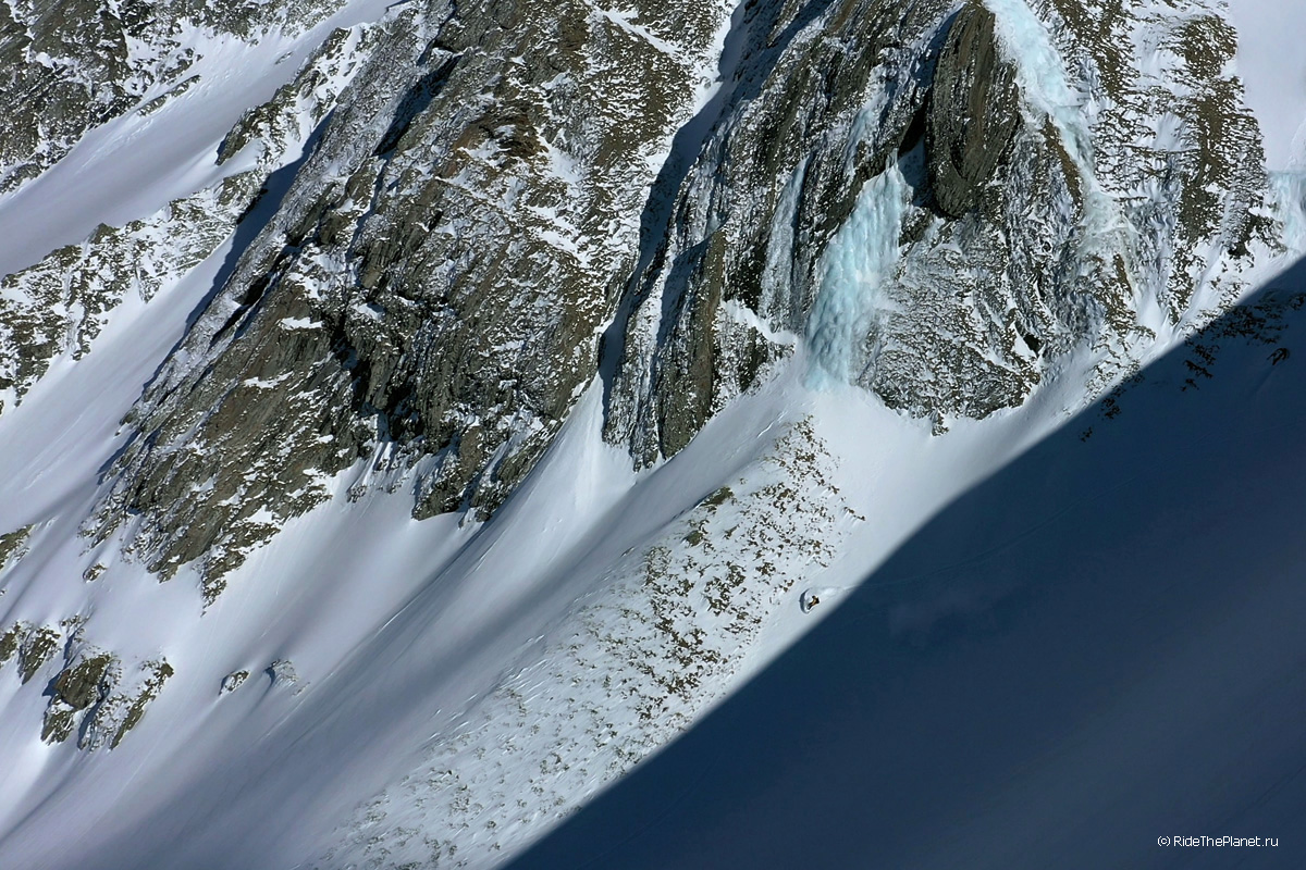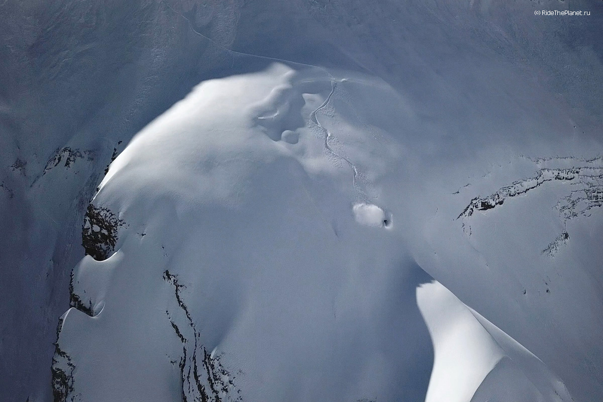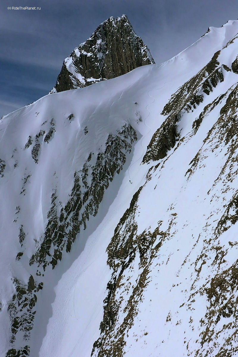 Гораздо логичнее здесь под хороший прогноз погоды заброситься в горы, обустроить базовый лагерь непосредственно «под рельефом» и затем раскатывать несколько дней интересные линии в этом районе.