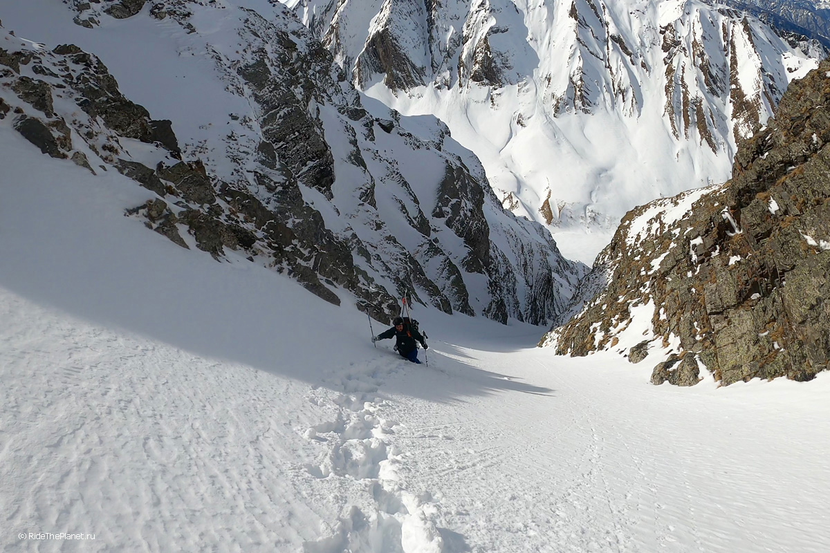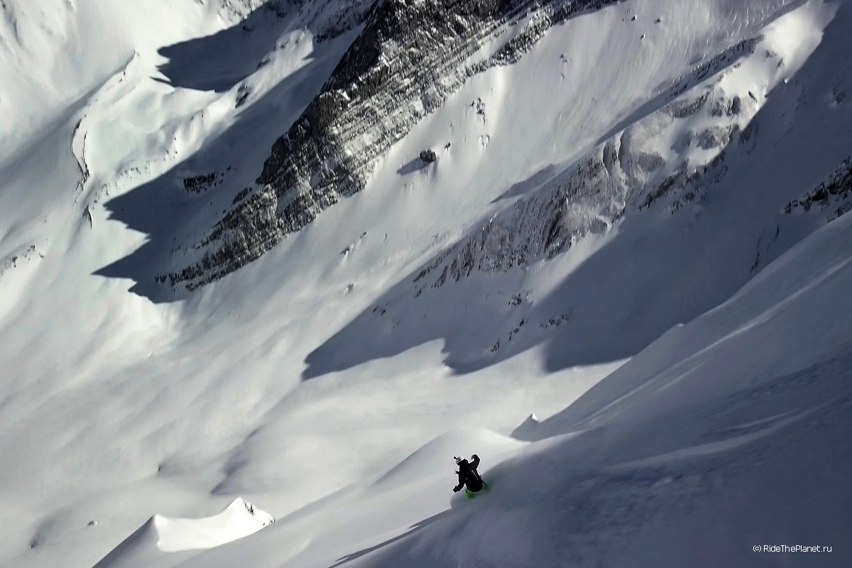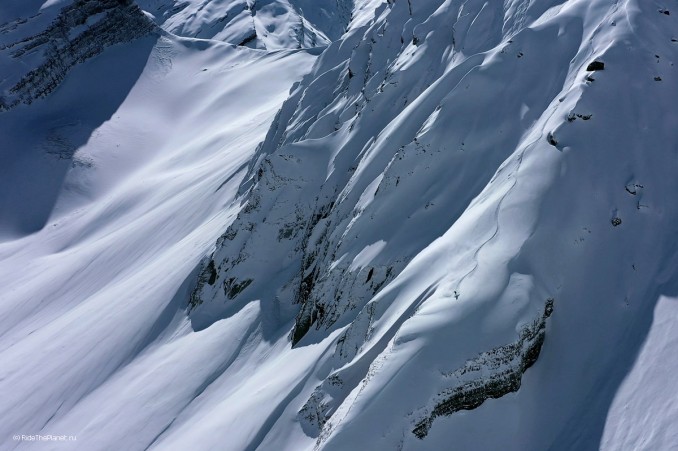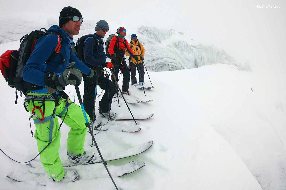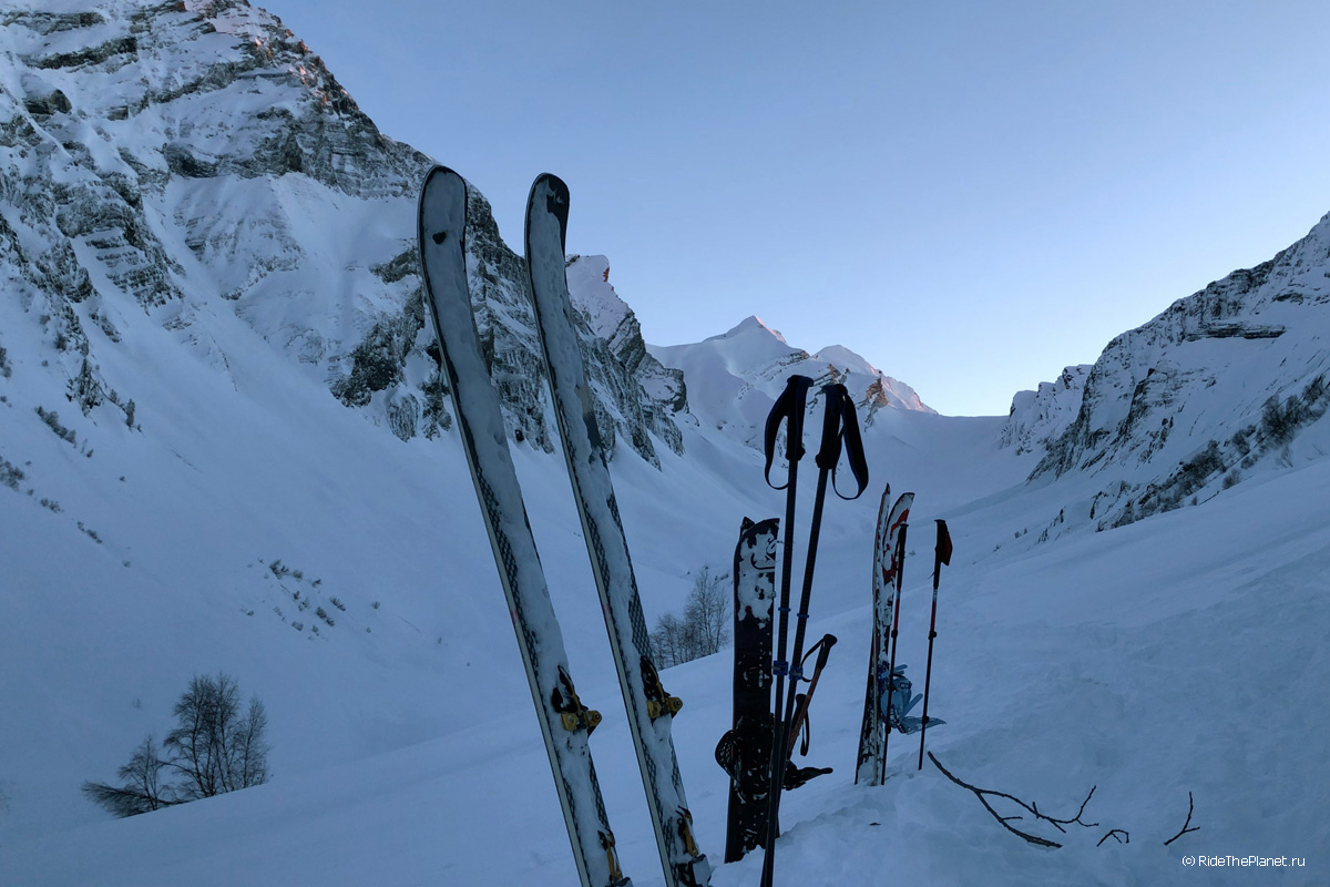 Гораздо логичнее здесь под хороший прогноз погоды заброситься в горы, обустроить базовый лагерь непосредственно «под рельефом» и затем раскатывать несколько дней интересные линии в этом районе.