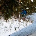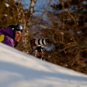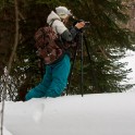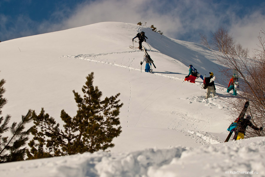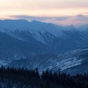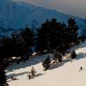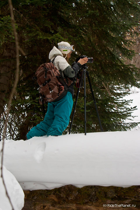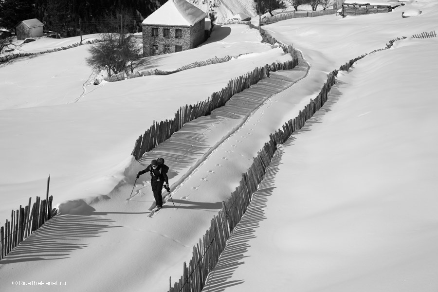 Переночевав, мы отправились на дневной бэккантри маршрут, подойдя уже близко к массиву Шхары, высочайшей горы Грузии. Несколько часов по сосновому лесу, выход из лесной зоны на ребра, вверх и вверх, к снежным полям… А потом — съемки с видом на ущелье и спуск вниз, с видом на боевые башни и каменные дома «нашей» деревни. Пара самых ярких дней в нашем путешествии.