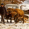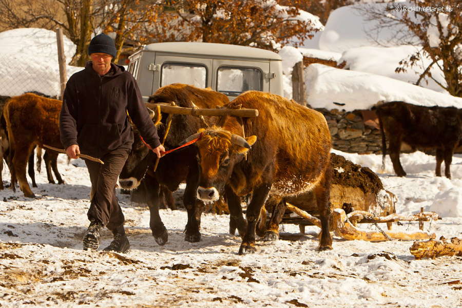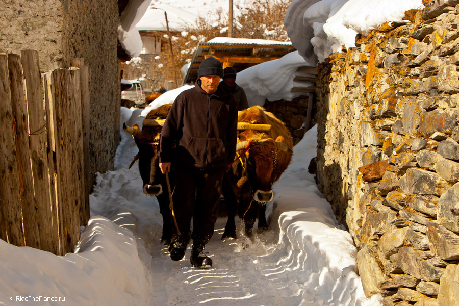 Традиционные деревянные сани, запряженные быками, до сих пор главный грузовой транспорт в сванских деревнях, они способны преодолеть любые неровности рельефа. Уклад деревенской жизни в Сванетии не сильно изменился — хотя рядом с башнями восьми-десятивековой давности устремились в небо и приемники спутниковых «тарелок».