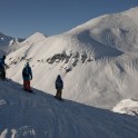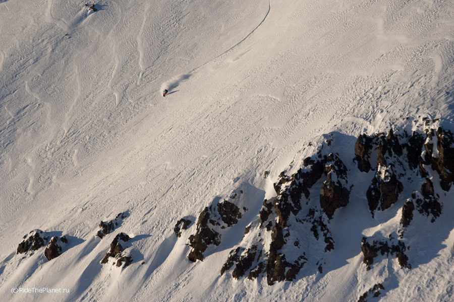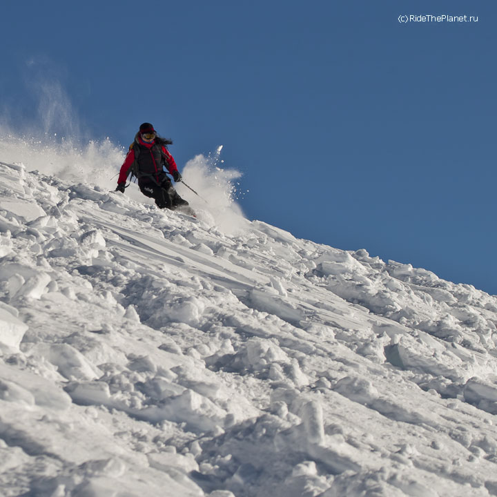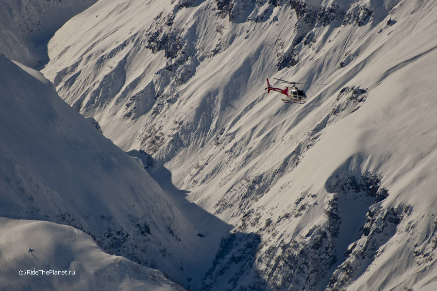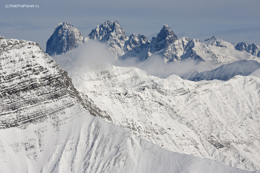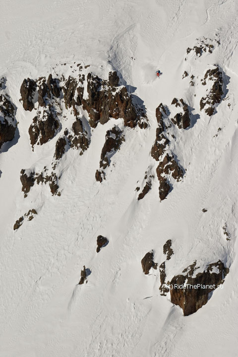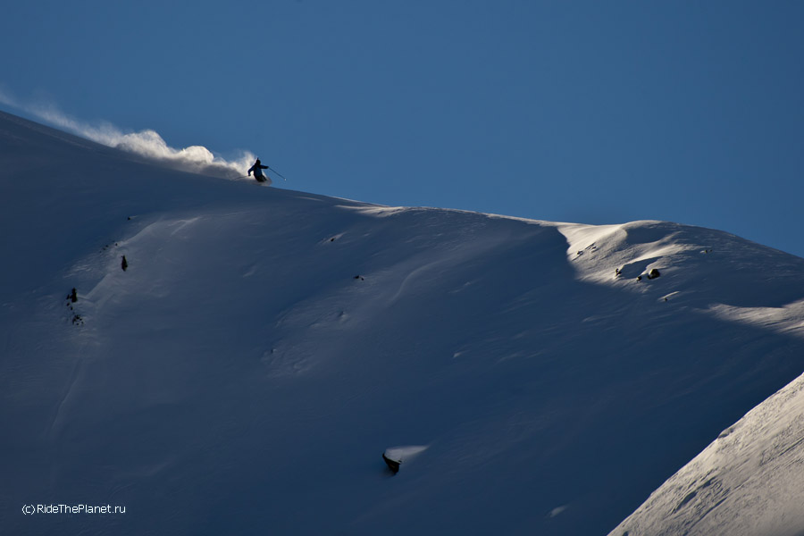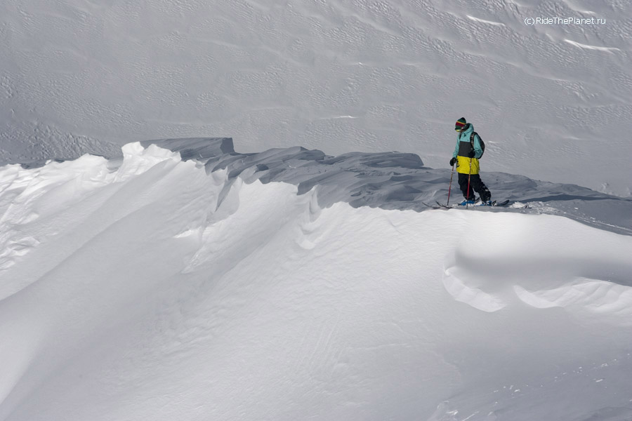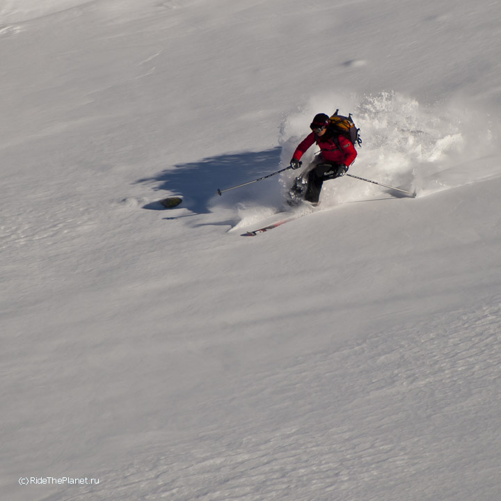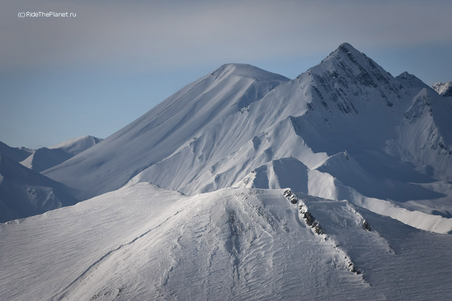 Так или иначе, нам удалось обойти многие бэккантри-маршруты в районе Гудаури – и понять, что здесь действительно стоит много ходить, и тогда можно найти замечательные, разнообразные рельефы. Потрясающие горы вокруг, напоминающие Аляску, конечно далеко не все доступны пешком, но в отдельные точки можно попасть с помощью вертолета – хели-ски в Гудаури есть, с канадскими и грузинским гидами, швейцарскими пилотами. И при благоприятной снежной обстановке вариантов для катания здесь масса, с любым уровнем сложности, от классических легких полей до десятков суровых кулуаров и стен со скальными рельефами.