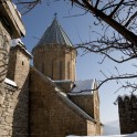 День без катания можно (и нужно) провести и в соседнем, Дарьяльском ущелье за Крестовым перевалом. Это ущелье писали Айвазовский и Куинджи, о нем слагали свои строки Пушкин, Лермонтов, была в его истории и такая страница, когда оно было перегорожено деревянной стеной с воротами… Упоминания о пути через Дарьяльское ущелье можно встретить уже у древнеримского энциклопедиста Плиния. А для современной Грузии это место имеет большое значение, так как здесь находится одна из главных святынь православной Грузии. За полтора часа доехав на машине от Гудаури до селения Степанцминда, можно за час подняться к храму Троицы — Самеба (XIV в.), стоящему прямо у подножия Казбека на высоте 2170 м. Зимой придется протаптывать тропинку в лесу, можно сходить и на ски-туре. Тогда от храма можно не возвращаться пешком, а отлично съехать — через чистый и редкий сосновый лес, в деревню Гергети. Этот подъем – начало маршрута альпинистского восхождения на Казбек с грузинской стороны.