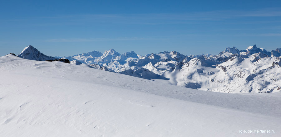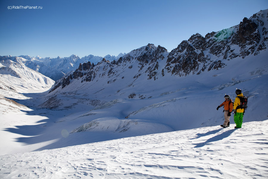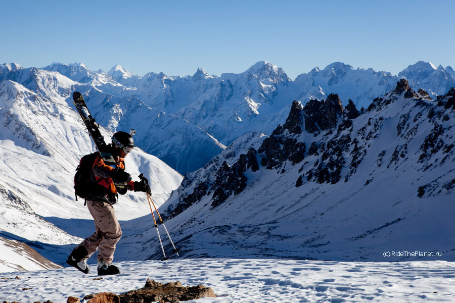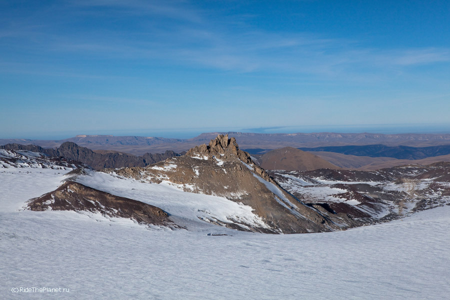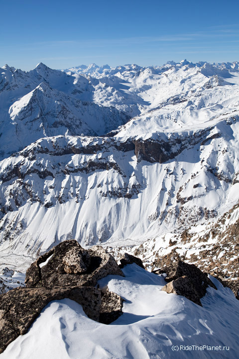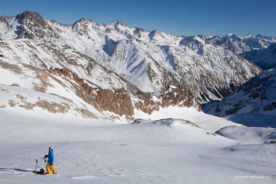 Так странно было высадиться на перевал Ирик-Чат, где когда-то ночевали пару дней в палатке, пережидая непогоду, при восхождении на Эльбрус с востока... Те же картинки, только все в снегу. И можно встегнуться в доску -лыжи и мчать вниз, долго и плавно. Не самый плохой день, факт!