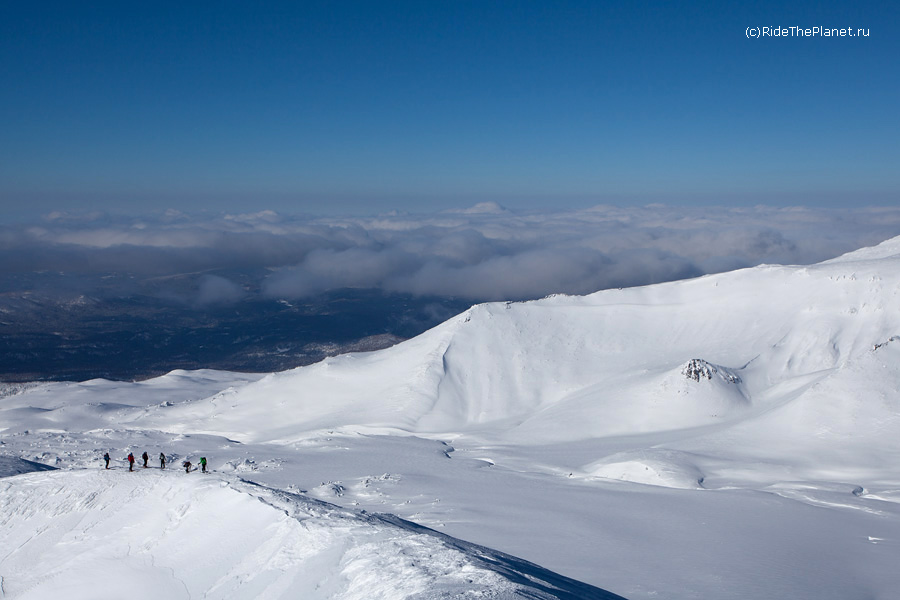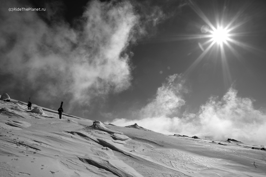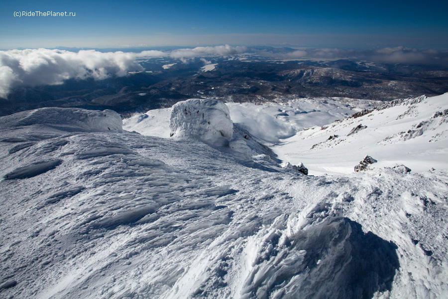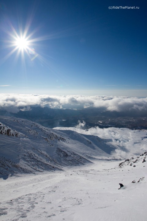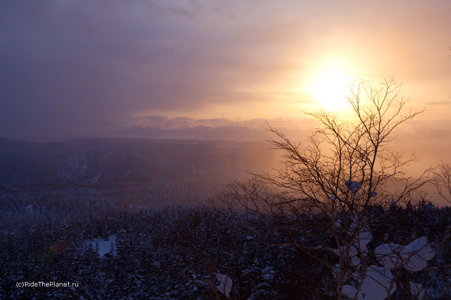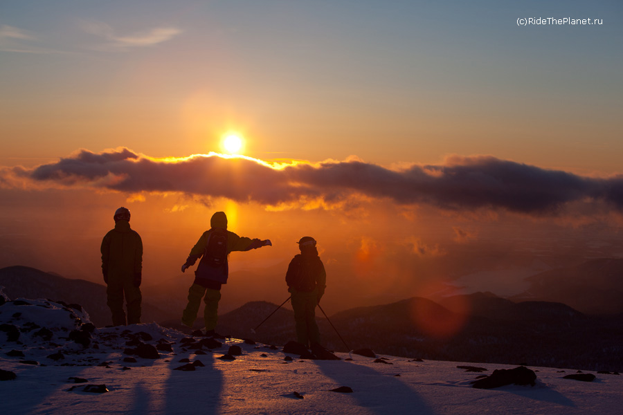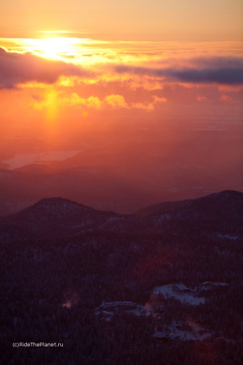 Сюда доезжает, даже в суперлогистической Японии, только один автобус в день. Asahidake — полная противоположность Нисеко с десятками канатных дорог и тысячами туристов со всего мира. Нам повезло, и почти все четыре дня в Asahidake было солнце. Но вместе с солнцем сильный мороз и ветер. Вчера вскарабкались с Аней Ханкевич на вершину вулкана Asahi и скатились в кратер. Казалось, что если пристально всмотреться с вершины в горизонт на севере — то увидишь Сахалин и Камчатку. Но это вымысел — Земля огромная :) Потом провожали японское солнце за горизонт ...