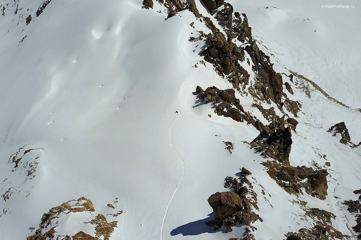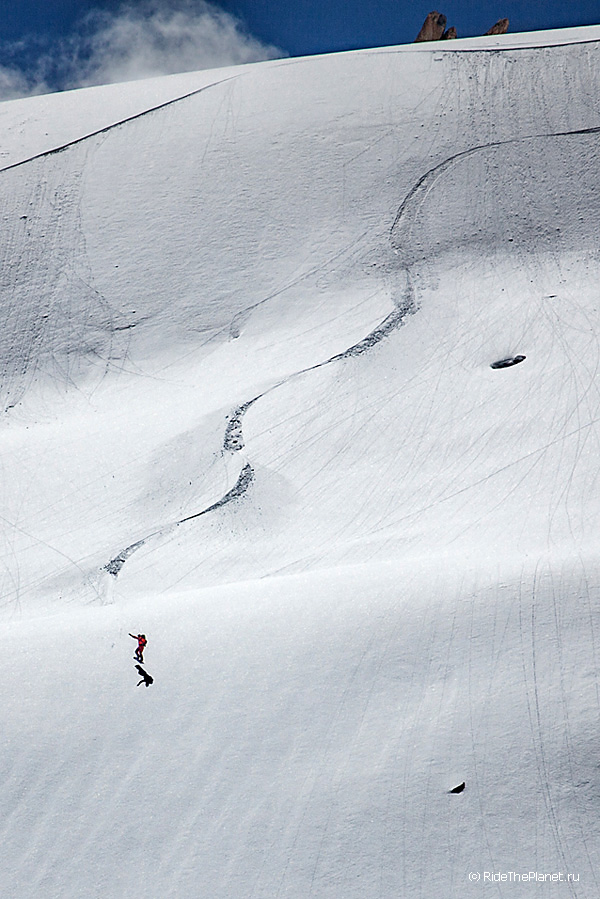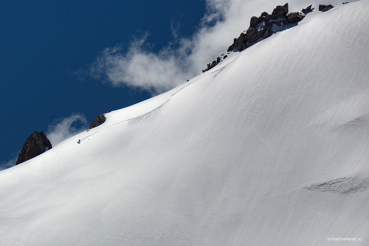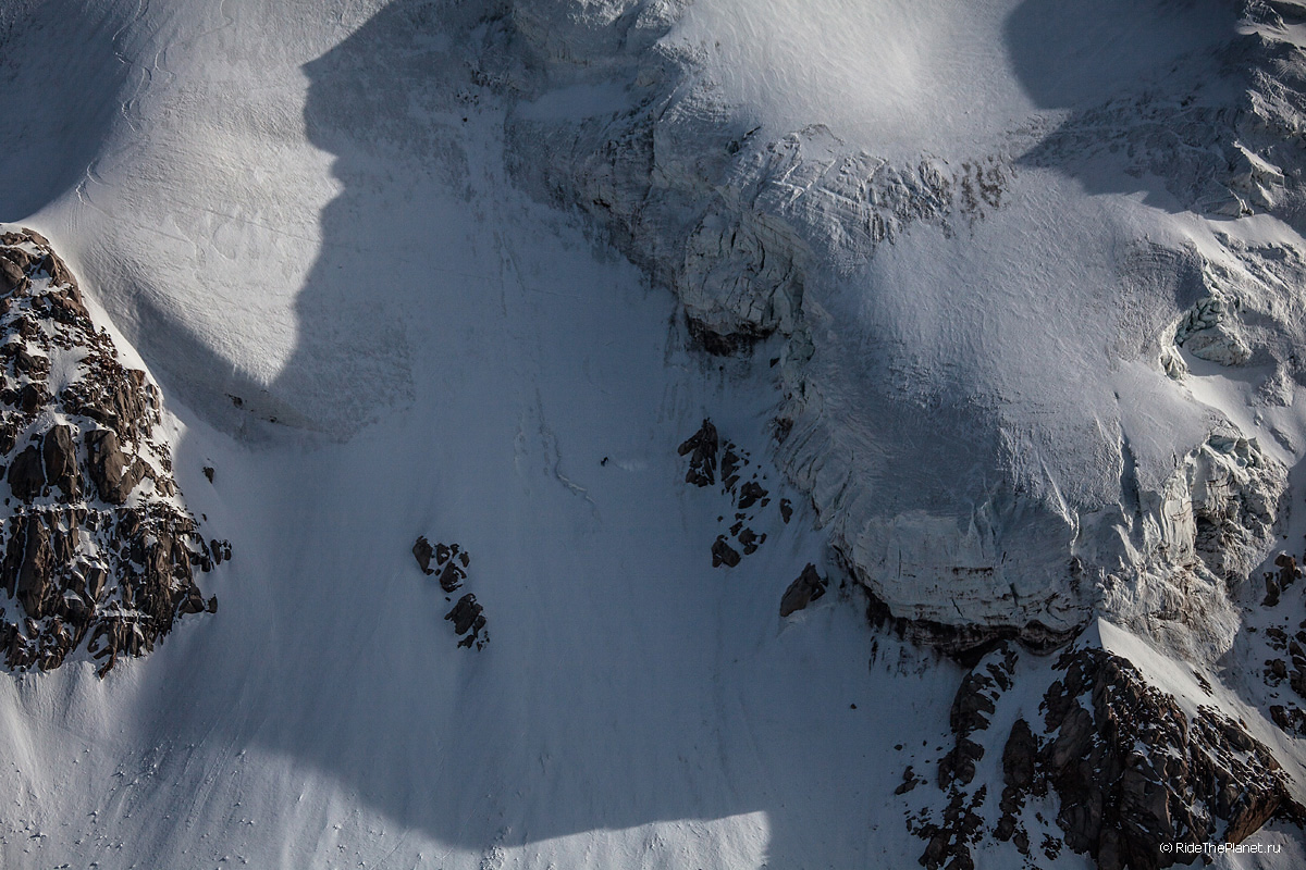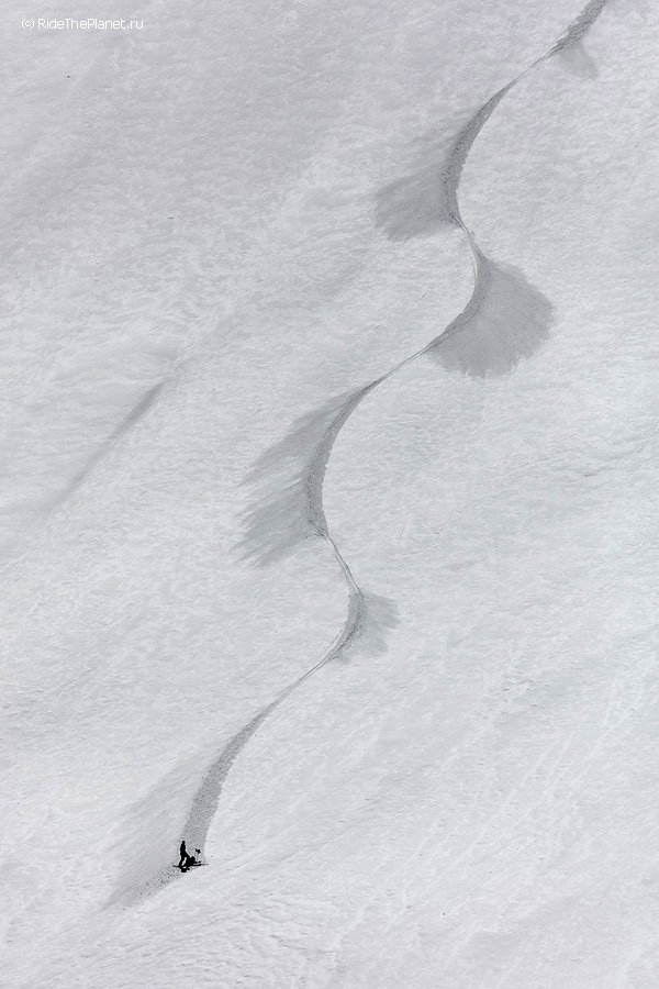 Поднимаясь наверх ты всю дорогу и на каждом привале рассматриваешь свою задуманную линию спуска, запоминаешь рельеф и прокручиваешь в голове каждое движение. Выходишь на старт на вершине или гребне и зачастую видишь перед собой только линию перегиба склона на леднике, ни ориентиров ни хоть какой-нибудь зацепочки… Ладно, разберемся по ситуации. «Операторы готовы? Райдер готов? Три, Два, Один, поехали!»
