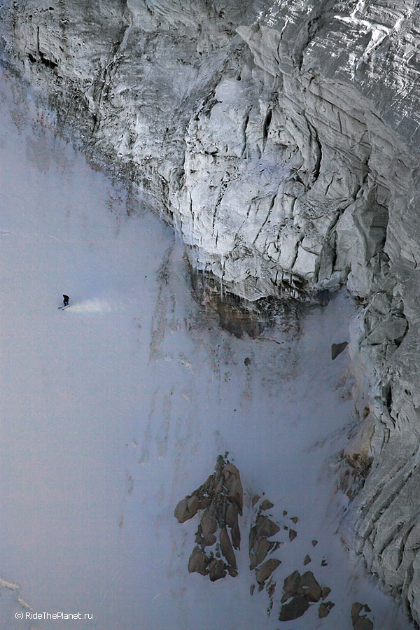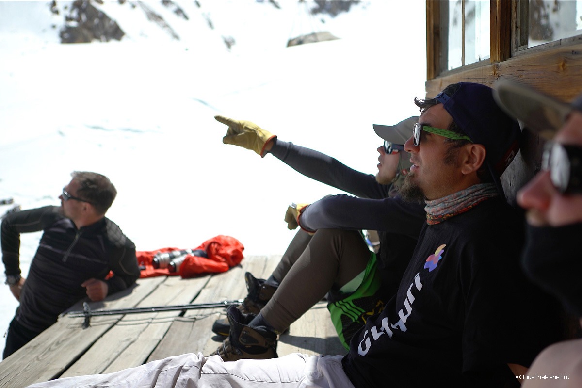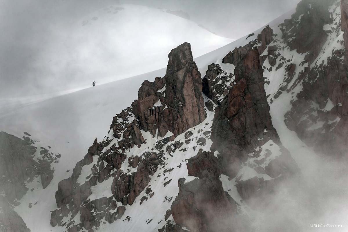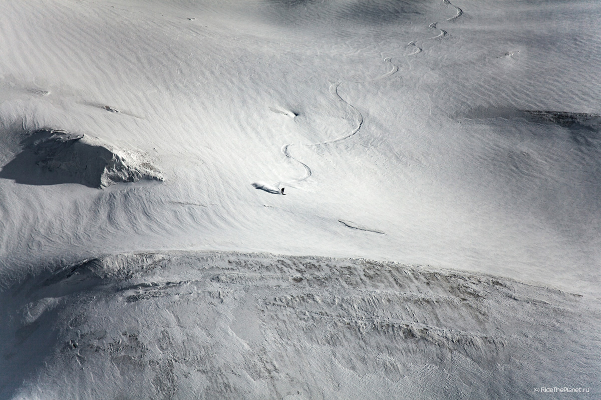 Поднимаясь наверх ты всю дорогу и на каждом привале рассматриваешь свою задуманную линию спуска, запоминаешь рельеф и прокручиваешь в голове каждое движение. Выходишь на старт на вершине или гребне и зачастую видишь перед собой только линию перегиба склона на леднике, ни ориентиров ни хоть какой-нибудь зацепочки… Ладно, разберемся по ситуации. «Операторы готовы? Райдер готов? Три, Два, Один, поехали!»