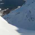 Норвегия — довольно большая и разнообразная с точки зрения ландшафтов и климата страна. Северные и северо-восточные районы Норвегии находятся за полярным кругом, и природа там радикально отличается от юго-запада страны. Думаю, Лофотенский архипелаг более корректно сравнивать с центральными горными районами Норвегии, где находятся самые высокие горные массивы, ледники и обилие фьордов с северной стороны. Лофотены чем-то похожи на эту часть Норвегии, то же сочетание гор и воды во всех формах — фьорды, озера, открытые морские пространства. Но на Лофотенах все более компактно. Острова архипелага связаны отличными дорогами, идущими обычно по побережью, сложной системой тоннелей и мостов и поэтому, когда перемещаешься на машине, то картинка и ландшафты меняются очень быстро. Хочется отдельно отметить сложность и разнообразие горных рельефов на Лофотенах. Здесь очень трудно найти два одинаковых ущелья или массива — все горы, заливы и фьорды имеют совершенно разные формы. Суровые скальные бастионы могут соседствовать с пологими долинами или плато. Но на мой взгляд, в целом на архипелаге преобладают достаточно крутые склоны, со множеством скальных выходов, кулуаров. При том, что абсолютная высота горных массивов на Лофотенах не велика и редко превышает 1000 м н.у.м. — из-за того, что горы «вырастают» прямо из моря, залива или фьорда, часто довольно сложно на взгляд оценить масштаб и рельеф этих массивов. Поскольку на архипелаге преобладает морской климат, погода меняется довольно резко, причем иногда радикально — за какие-то полчаса пурга с сильным ветром и снегом может смениться солнцем и штилем. Пару раз за наше пребывание на Лофотенах мы в течение одного дня меняли районы катания из-за погоды. Где-то может быть свинцовое небо и снег, а буквально в 20 минутах на машине, через пару тоннелей и пару мостов, светить солнце.