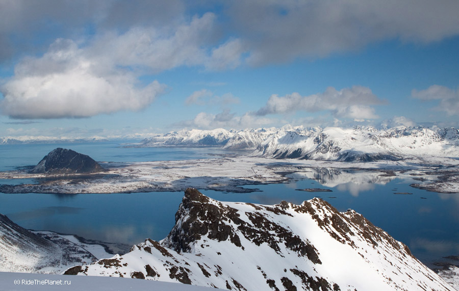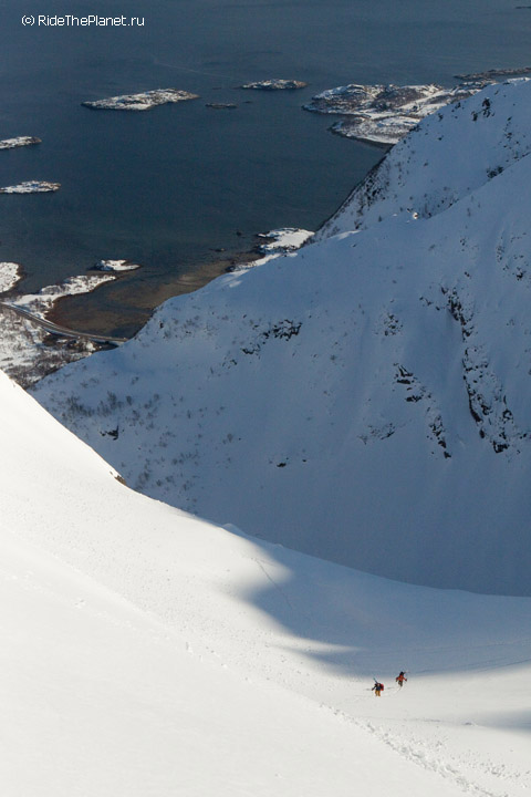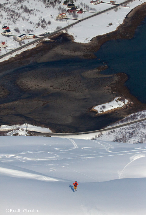 Проблема на Лофотенах одна — сделать выбор, глаза разбегаются. Думаю, на этом архипелаге можно провести, занимаясь бэккантри, всю жизнь и не повторяться с маршрутами. Архипелаг весь покрыт горами, и он не мал: чтобы проехать его с запада на восток на машине без остановок потребуется 5-6 часов... А останавливаться здесь хочется постоянно. В какой-то момент говоришь себе: «Всё, больше не останавливаюсь и не достаю фотокамеру. Просто еду вперед! Мы же планировали доехать сегодня в пункт А!»