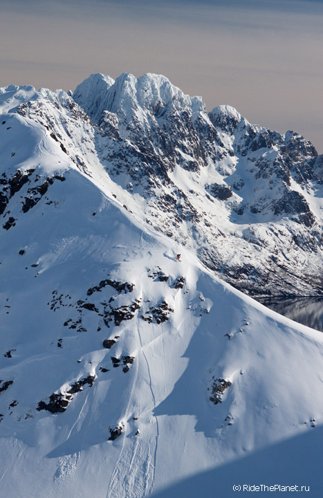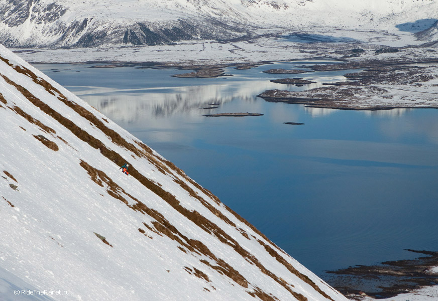 Горные рельефы на Лофотенах довольно сложные и разнообразные — здесь можно найти практически все: крутые кулуары с перепадом до 800 метров, спадающие от вершины к подножию, снежные поля со множеством микрорельефа, лесные зоны в нижней части склонов. И вся наша команда отметила, что эти горы не похожи ни на что, где нам до этого удалось побывать.