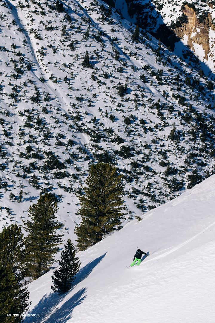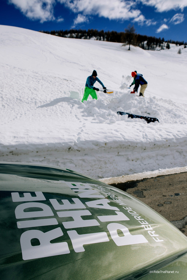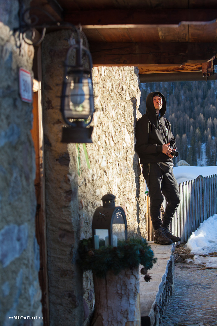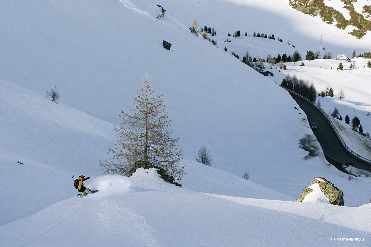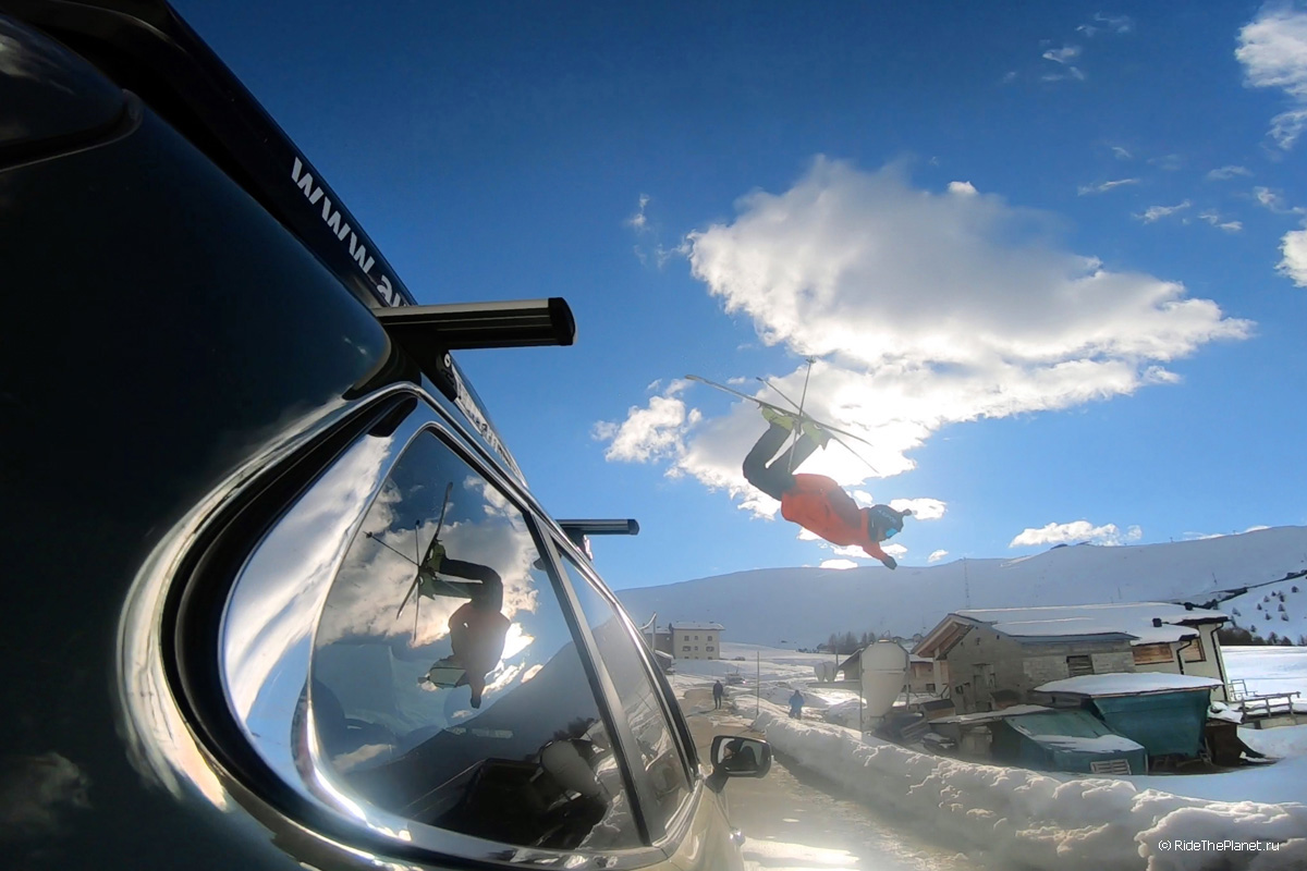 Сейчас же я был впечатлен масштабами и доступностью зоны фрирайда. Здесь большие горы, есть и альпийские скальные зоны и неплохой “катабельный” лес. Поразило обилие рельефа для бэккантри фристайла – много плавных гребней, перегибов и обширных снежных полей. К сожалению, незадолго до нашего приезда сильный ветер сдул весь свежий снег на большинстве склонов, оставив заструги и непробиваемый наст, поэтому нашей команде пришлось изрядно погулять на сплитбордах и скитуре по окрестным долинам, чтобы найти подходящие рельефы и хороший снег. Зато мы многое увидели. Порадовала погода – все время нашего пребывания в Ливиньо светило солнце, некоторые картинки из этого путешествия навсегда останутся в памяти.