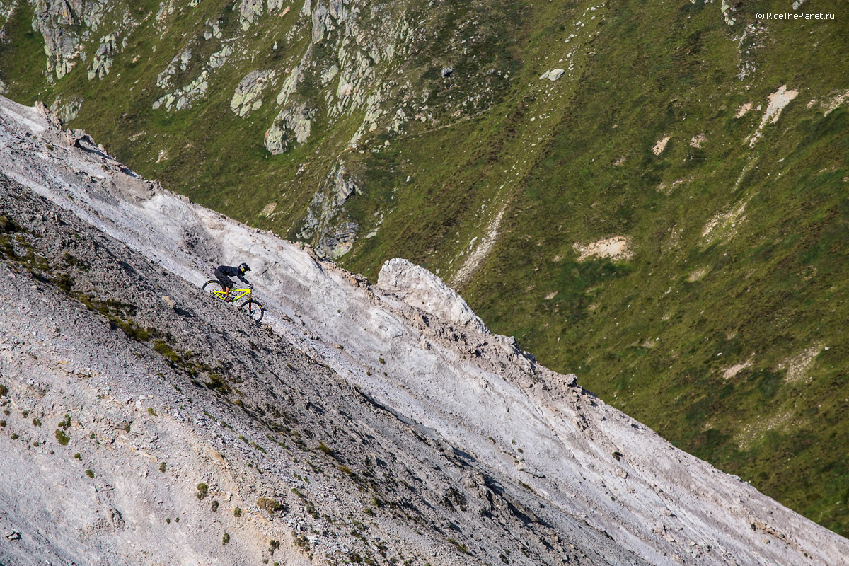 Сейчас на съемках в Италии, в один из дней мы нашли очень масштабный и эффектный склон для катания со средним уклоном около 35 градусов и приемлемым выкатом. Когда мы детально просмотрели линию, оказалось, что для спуска возможно лишь узкое ребро между двумя огромными кулуарами, и у тебя есть не более 6-7 метров ширины на 300-метровом склоне, и на скорости 40-50 км/ч там очень опасно. На спуске, стоило мне отпустить тормоза на несколько секунд, как я сразу разогнался до 50 км/ч и уже пытаясь тормозить понял, что места недостаточно, и чтобы не улететь вниз в кулуар, плавно задрифтил, погасил скорость и лег на бок – другого варианта не было.