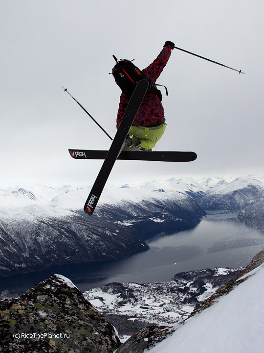 Еще на два дня нашей базой стал городок Стрин с местным небольшим ски центром, по привычной уже норвежской технологии в этой местности — парковка, помещение кафе и пара бугельных подъемников с большим перепадом. Снова съемки на фоне фьорда, немного дропов ближе к вершине, там же замечен чудесный лес с подушками, но качество снега не позволило оценить все его достоинства.