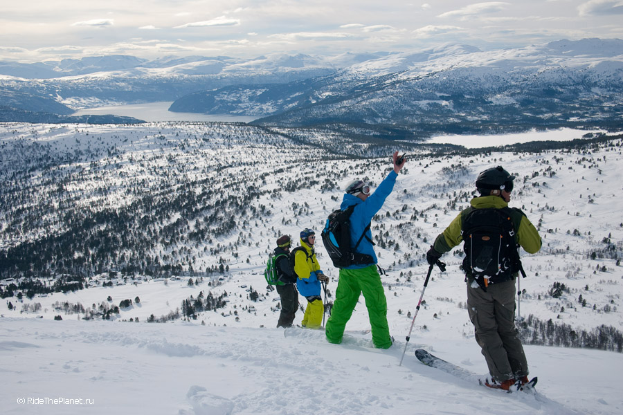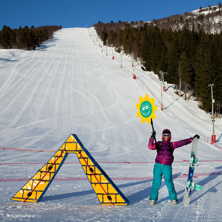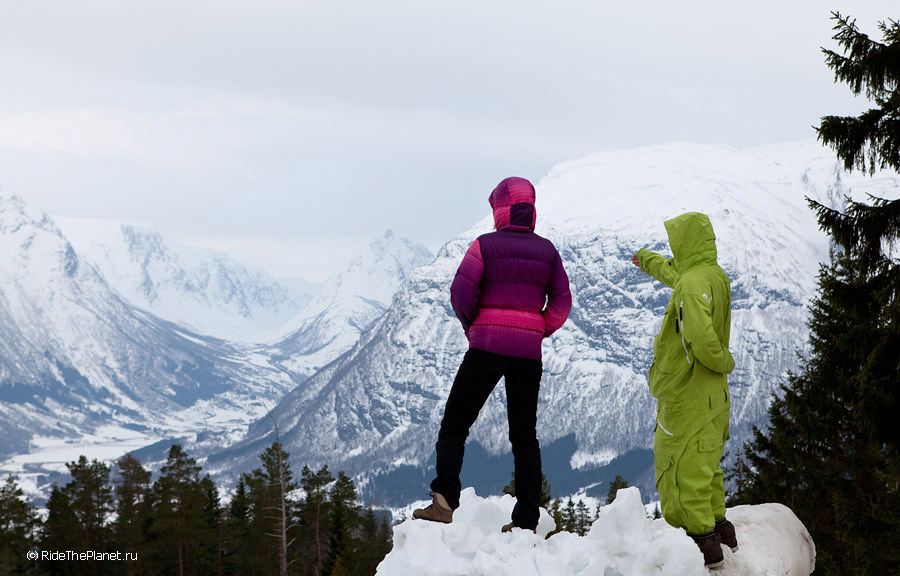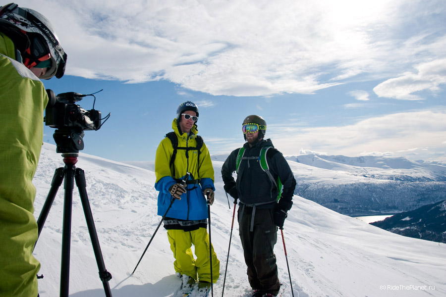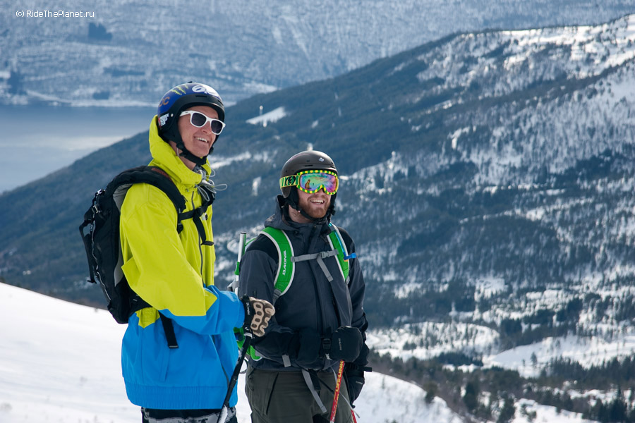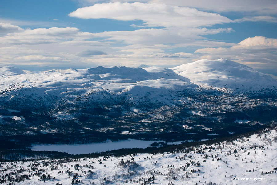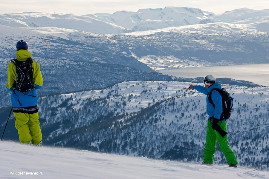 Дорога заняла у нас пару часов, и за это время пейзажи вокруг поменялись. Вместо острых пиков и скалистых стен – более плавные очертания, широкие долины. Когда с утра специально для нас раскочегарили подъемник, поднявшись до середины склона, мы обнаружили вид на фьорд и замерзшие озера, гигантские поля вокруг и ровный, дующий 8-9 м/с ветер. Идеальное место… для кайтбординга, конечно. Небольшие траверсы в стороны – и можно найти лес, довольно крутые участки со скалами. Если забираться немного дальше и выше, то на этой же горе есть масса вариантов рельефа, но это уже формат ски-тура, характерный для Норвегии. Увидев этот склон, Егор Сорокин резюмировал – “здесь хоть этап Freeride World Tour проводи!”