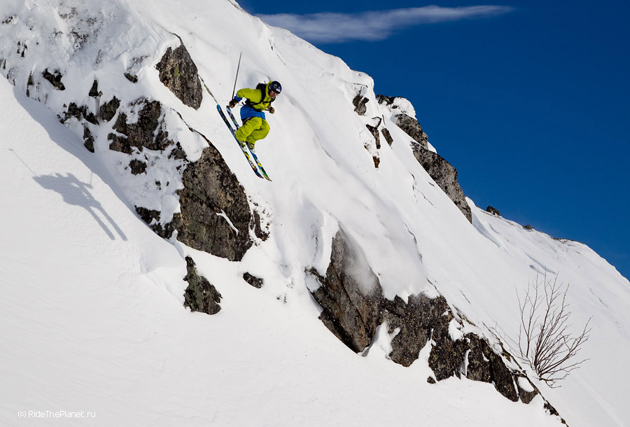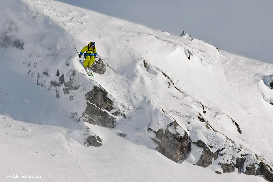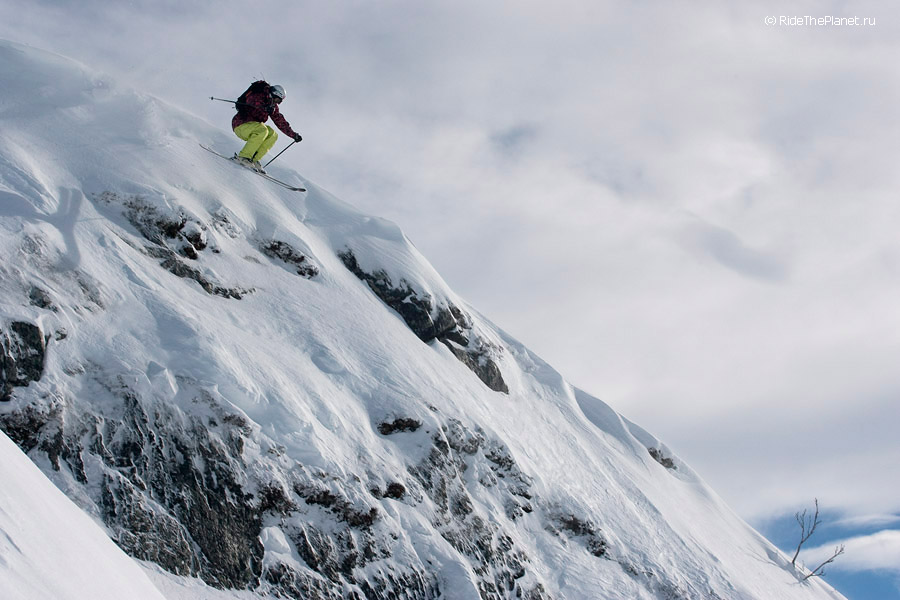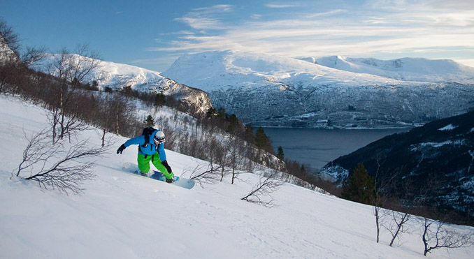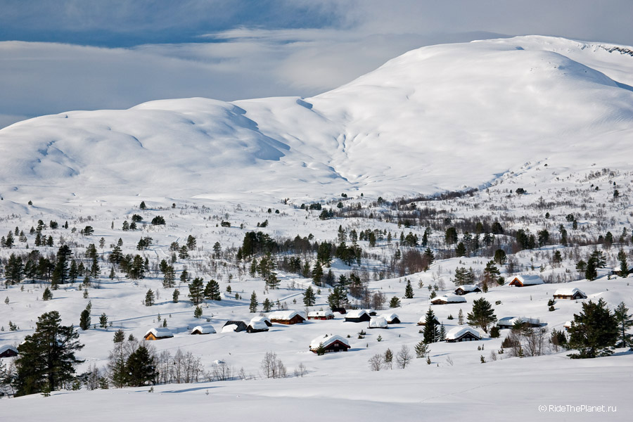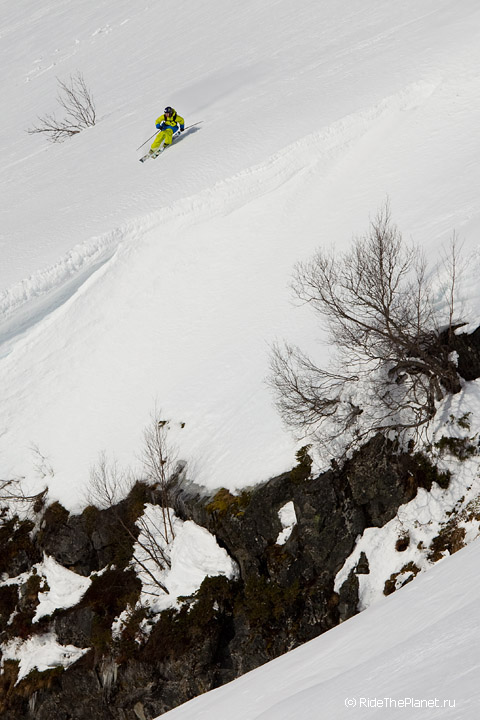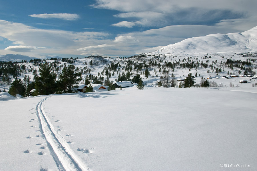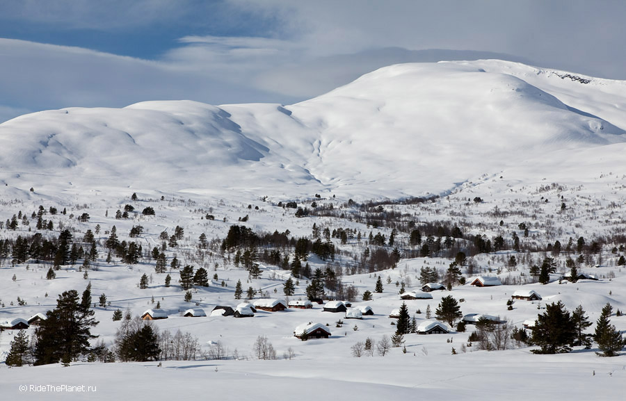 Дорога заняла у нас пару часов, и за это время пейзажи вокруг поменялись. Вместо острых пиков и скалистых стен – более плавные очертания, широкие долины. Когда с утра специально для нас раскочегарили подъемник, поднявшись до середины склона, мы обнаружили вид на фьорд и замерзшие озера, гигантские поля вокруг и ровный, дующий 8-9 м/с ветер. Идеальное место… для кайтбординга, конечно. Небольшие траверсы в стороны – и можно найти лес, довольно крутые участки со скалами. Если забираться немного дальше и выше, то на этой же горе есть масса вариантов рельефа, но это уже формат ски-тура, характерный для Норвегии. Увидев этот склон, Егор Сорокин резюмировал – “здесь хоть этап Freeride World Tour проводи!”