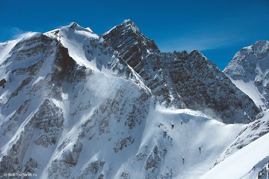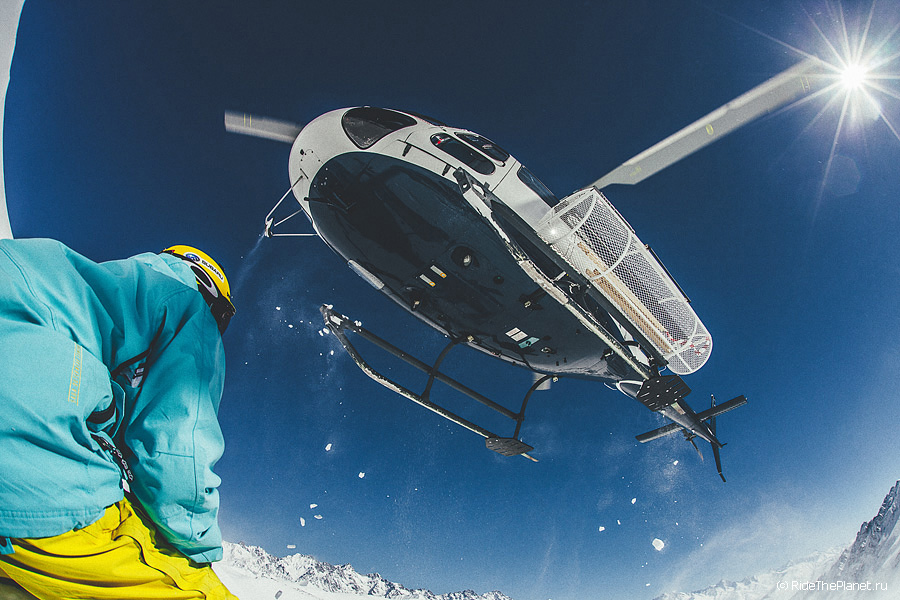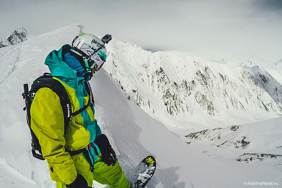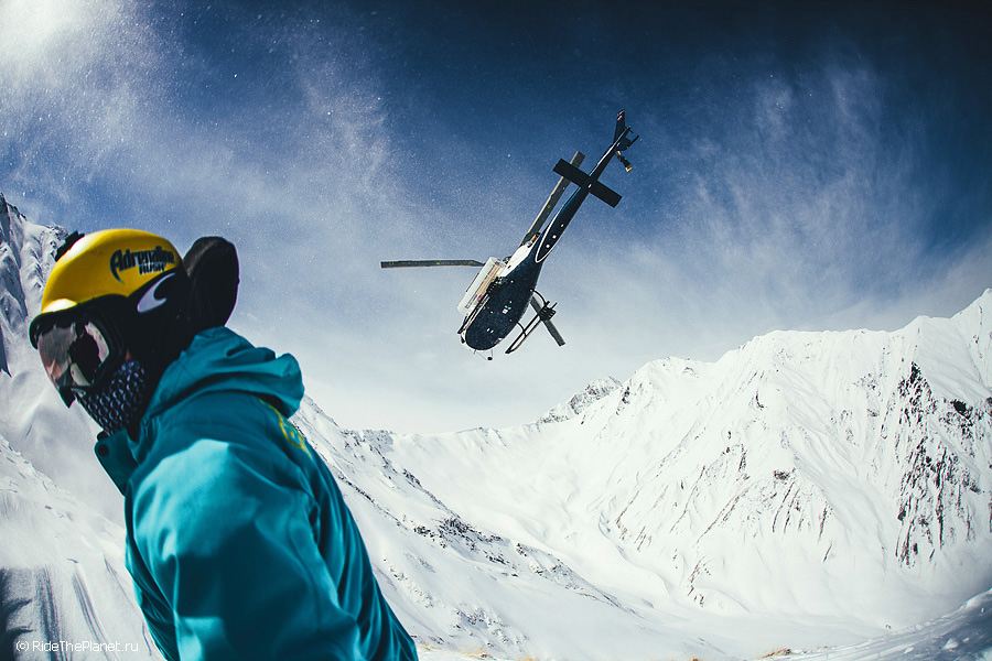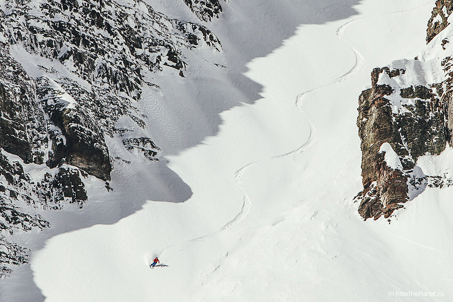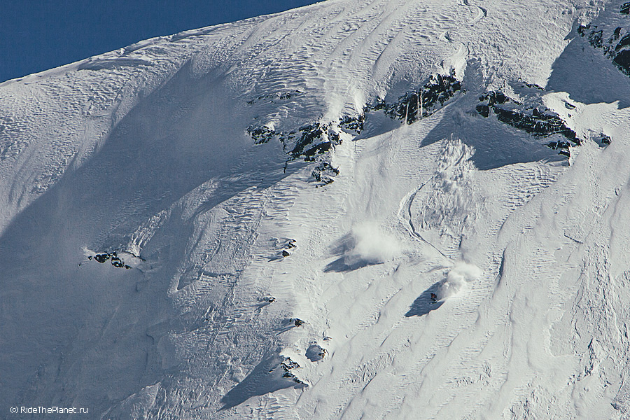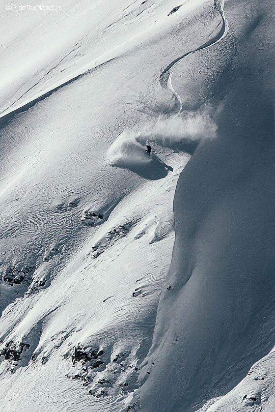 «Формат съемок RideThePlanet очень специфичен и отличается от катания с группой во время работы гидом, от программ хели-ски и от соревнований по фрирайду. Здесь, особенно если мы используем вертолет, почти нет времени выбирать долго линию спуска, просматривать детально рельеф – на это обычно уходит не более минуты-двух во время подлета. И с вертолета зачастую очень сложно оценить масштаб и уклон склона. Поэтому часто приходится ехать почти «с листа», что конечно сложно, но дает неоценимый опыт, так необходимый райдеру. Это реальный фрирайд!»