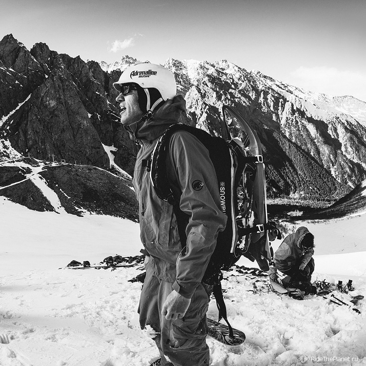 «Что касается самих съемок и впечатления от катания с командой RideThePlanet. Так получилось, что переменчивая апрельская погода дала нам совсем немного времени для съемок в Осетии, но нам удалось застать разнообразный снег и покататься в интересных местах. В первый день мы отправились на разведку и небольшой ски-тур к подножию ледника в Цейском ущелье. Снег не особо порадовал – весенний замерзший фирн – обычная картина для апреля на Кавказе. Но вечером и ночью прошел обильный снегопад. И первый день полетов на вертолете подарил нам несколько спусков с великолепным зимним «паудером» – снегом, что бывает лишь несколько раз в сезоне. Это снег, когда тебя накрывает с головой при движении, и не видно куда ехать дальше, а на склонах с уклоном меньше 20 градусов ты просто утопаешь по пояс в этой белой перине! В последующие дни снег в горах немного подсел, в долинах стал тяжелым и влажным, а в верхних зонах ветер сделал свое дело и появились корки и снежные доски. Но в целом, нам удавалось на северных экспозициях найти неплохой снег... Могу сказать, что рельеф и уклоны здесь кое-где такие, что бывало страшновато, тем более выбирать склон и линию спуска райдерам приходилось при подлете – за минуту, не больше.»