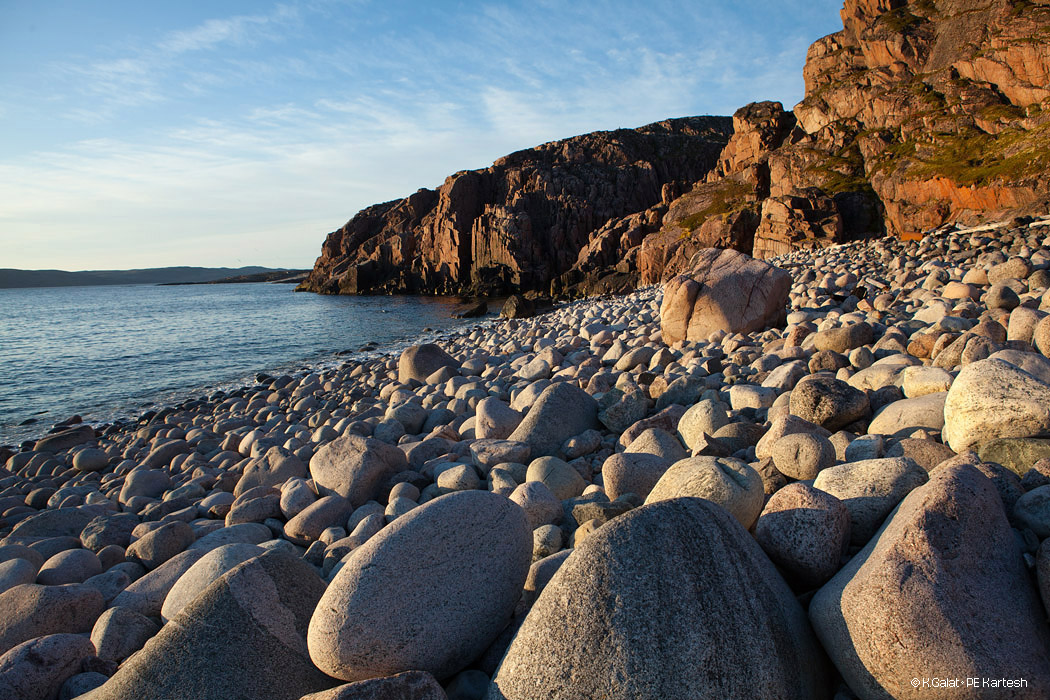 В районе Териберки побережье Баренцева моря имеет обрывистые скалистые берега и бухты с уникальными валунными пляжами. В тихую ясную погоду береговые рельефы и бухты здесь чем-то напоминают Крым в районе Балаклавы. Конечно, если не считать остатков снега в скальных ложбинах в середине июня!