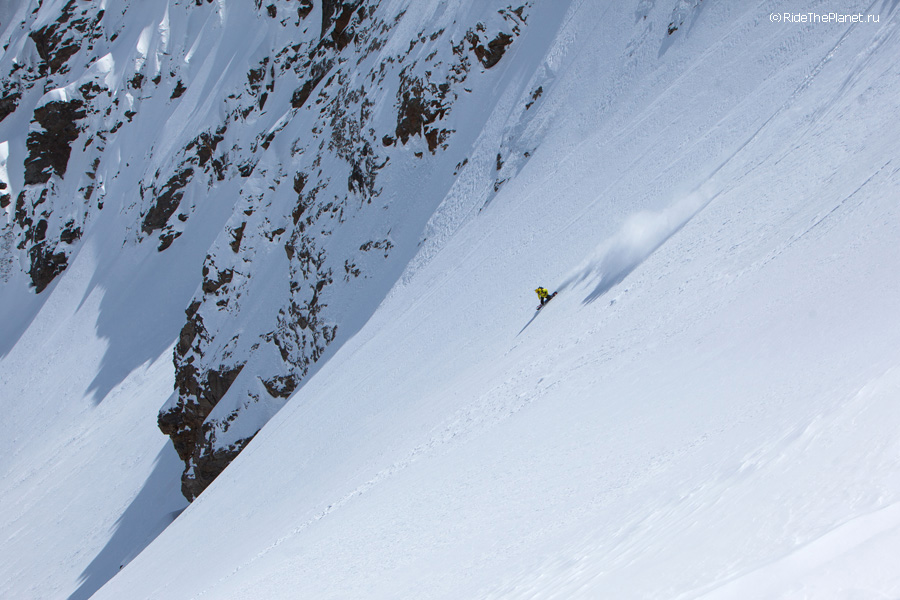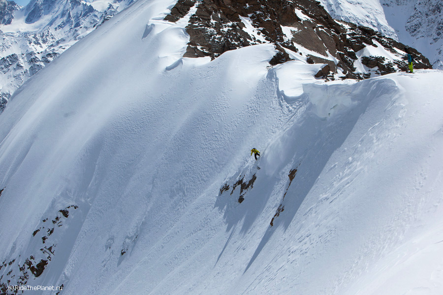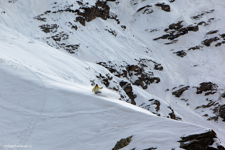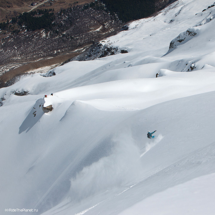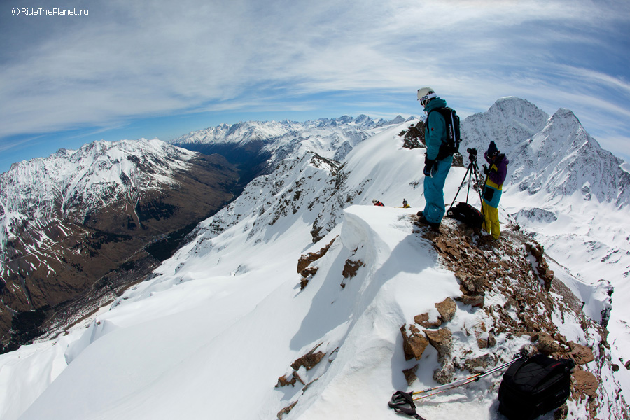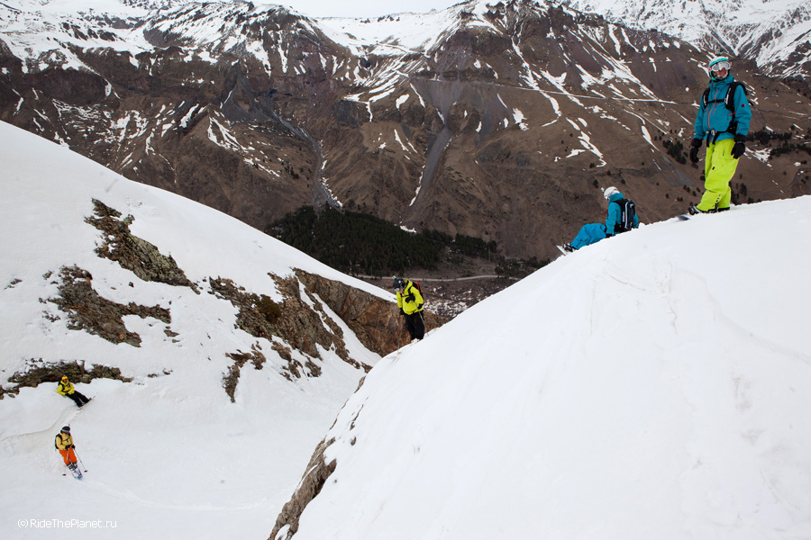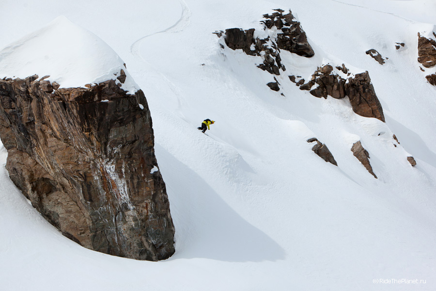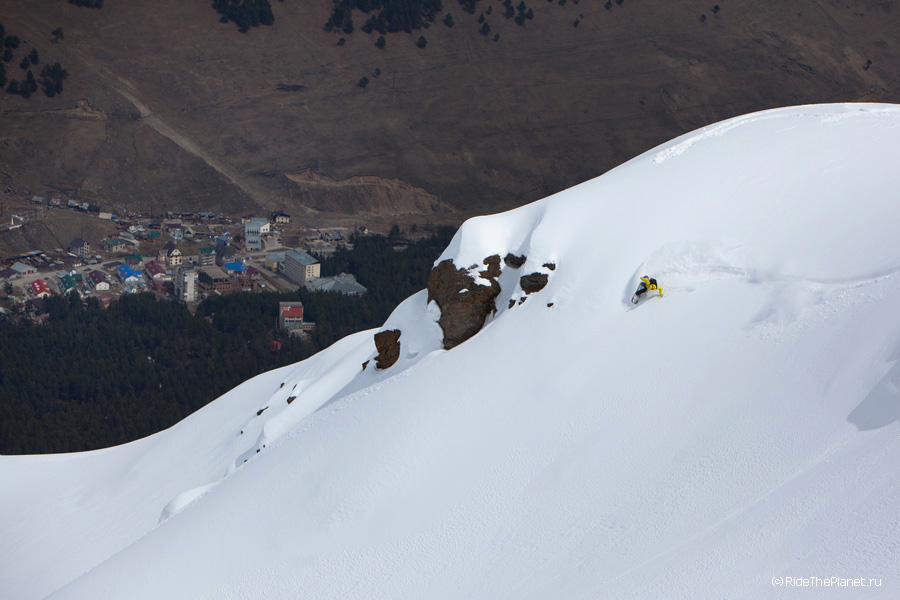 Высокогорный поселок Терскол, ставший базой для RideThePlanet в эти дни, — главная точка на фрирайд-карте России. Здесь родились и выросли Кирилл Анисимов и Александр Байдаев, горные гиды и опытнейшие фрирайдеры, постоянные участники съемок RideThePlanet. Многие месяцы и целиком зимние сезоны провели в Приэльбрусье Константин Галат и Егор Дружинин. Неудивительно, что в своих «домашних» горах большинство вариантов внетрассовых спусков для них знакомы и уже разведаны. Большинство, но, конечно же, не все — даже если кататься в Приэльбрусье годами, всегда останется, куда можно мечтательно посмотреть снизу. Этот район был и остается одним из интереснейших в мире по возможностям для фрирайда в формате big-mountain.