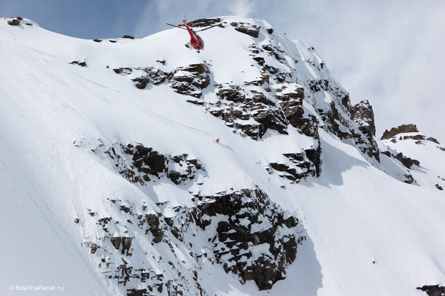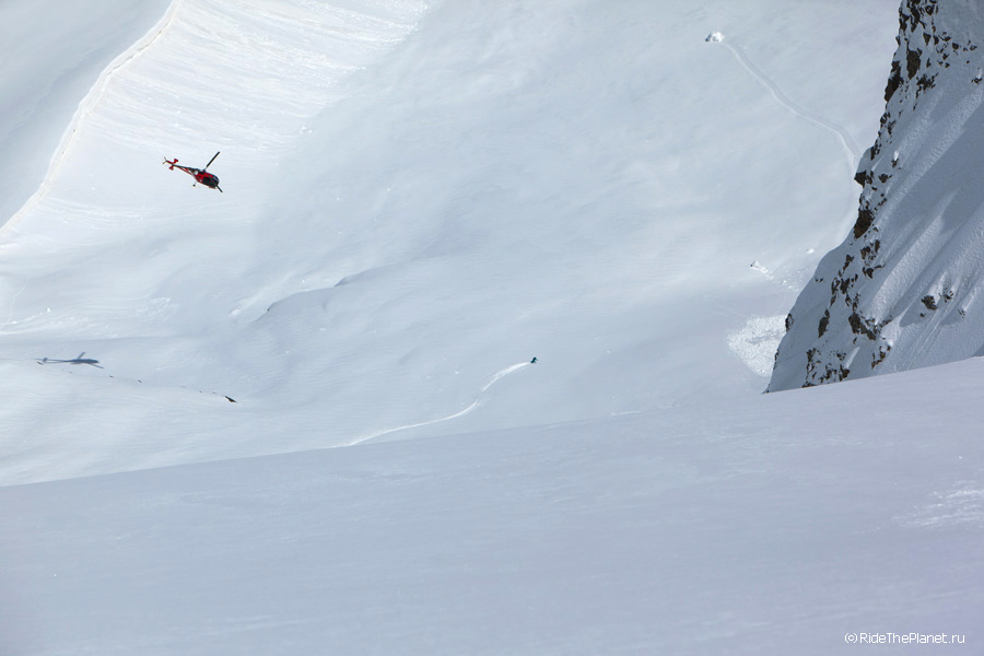 Для съемок в Приэльбрусье, как и год назад в районе Архыза, были запланированы заброски команды вертолетами в те точки, откуда начинаются «линии мечты». Легкие горные вертолеты Lama и Alouette и пилоты компании Heliaction помогают райдерам и съемочной группе в считаные минуты перемещаться в сложных рельефах. Гребень и вершина Чегета, скальные «рога» на высоте около 3700 метров с нисходящими узкими кулуарами и снежными полями, — одна из таких целей. До стартовой точки пришлось бы пешком предпринять трех-четырех часовой переход от конечной станции канатной дороги по узкому скальному гребню. Некоторые линии в Северном цирке Чегета райдерам удалось проехать в эти дни впервые. Cпасибо Чегету, стабильному снегу и погоде!