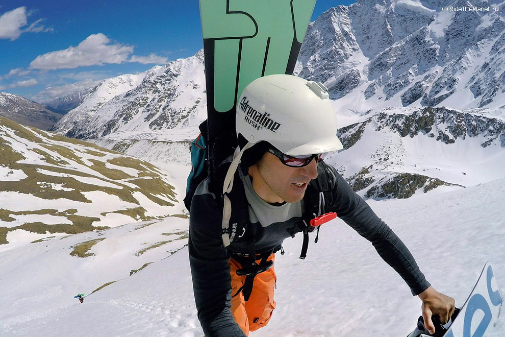 «Во второй день в Приэльбрусье мы запланировали поход к новым линиям, где ещё не катались. Для спортсмена и фрирайдера это как красная тряпка для быка, вызывает возбуждение и волнение. Для меня этот день стал важнейшим событием этой поездки. Раннее пробуждение, долгие подходы, пятичасовой подъём с элементами альпинизма, где приходилось пролезать скальные полки и отвесы каменных гряд, но цель была уж слишком желанной… Я готов был лезть до самой ночи, следующий день, сколько угодно. В 17.15 я стартовал в запланированный кулуар. Закатное солнце, иногда выглядывая из-за облаков, позволяло рассмотреть рельеф кулуара, но в целом довольно поздний проезд был затруднён плоским светом – сложно было читать состояние снега и рассчитать скорость проезда. В целом получилась техничная быстрая линия, полная эмоций. Когда все райдеры сделали свои линии, мы еще долго сидели в долине под стенкой и смотрели на проезды, что-то обсуждали. Кулуар Кости Галата и Саши Байдаева решили назвать «Равенство», а кулуар, пройденный мной, назвали «Дружба». Затем всей дружной толпой покатились в долину под нависающими массивами Накры и Донгуз-Оруна, по пологим полям в закатном свете, через замерзшее озеро и по заснеженному южному каньону Чегета».