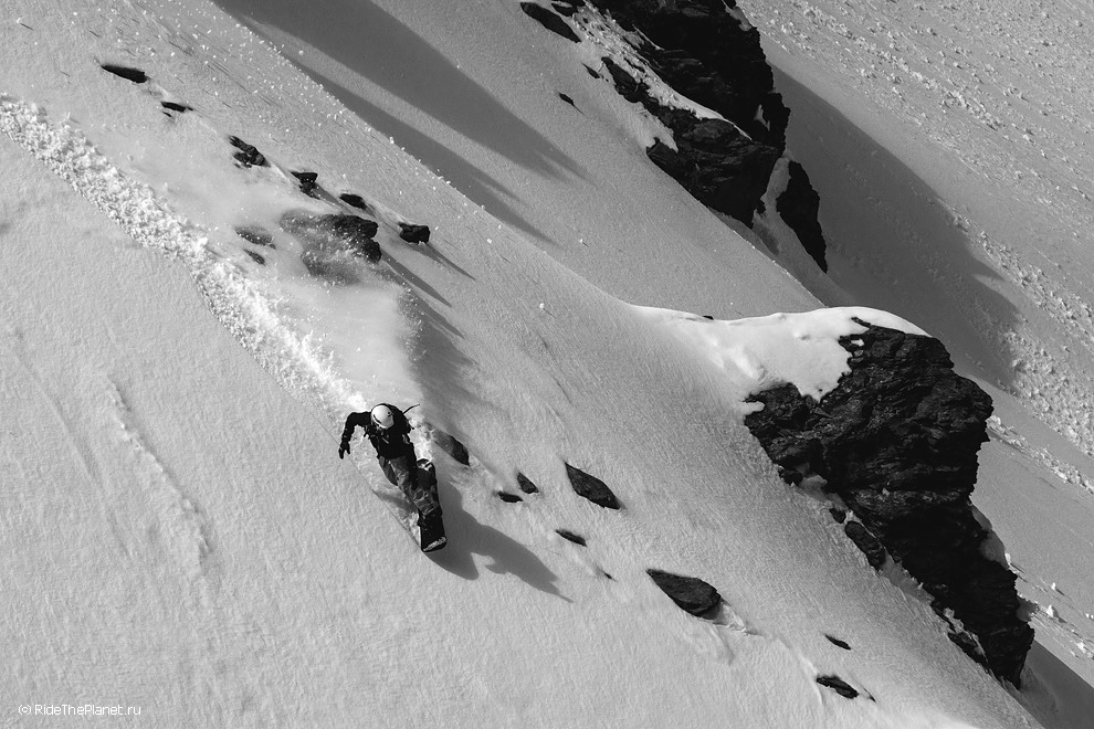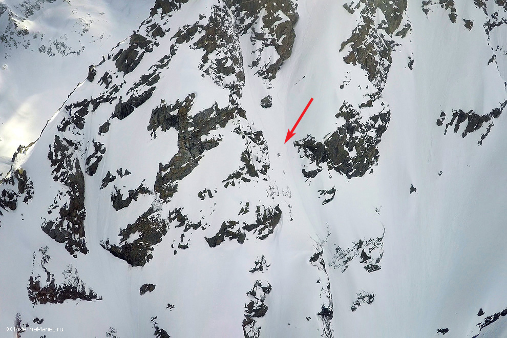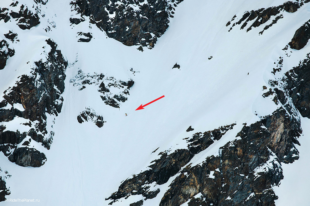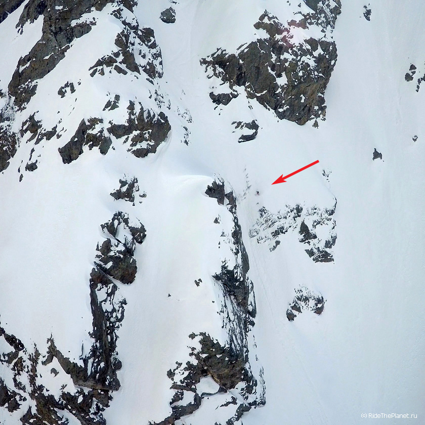 «Планируя этот трип и съемку, у меня не было иллюзий, что будет легко. Рассматривая спутниковые снимки гребня с Google Earth, я понимал, что для операторов и фотографов лазить по скалам со штативами и камерами и снимать наши проезды со стартового гребня – не самая хорошая затея. Поэтому съемочная группа расположилась на противоположном склоне ущелья, на ребре Южного цирка Чегета, на удалении более полутора километров от нас. Нам приходилось подолгу навигироваться с ними по рации – где находятся, куда и когда будут двигаться эти неразличимые глазу микро-точки на противоположном гребне огромной долины☺ И вся надежда снять наши проезды в приемлемом масштабе возлагалась на оператора дрона Олега Колмовского, который был с райдерами на стартовом гребне. И все, так или иначе, получилось! Спасибо погоде, спасибо дрону за то, что так далеко летал “по приборам” и каждый раз возвращался!»