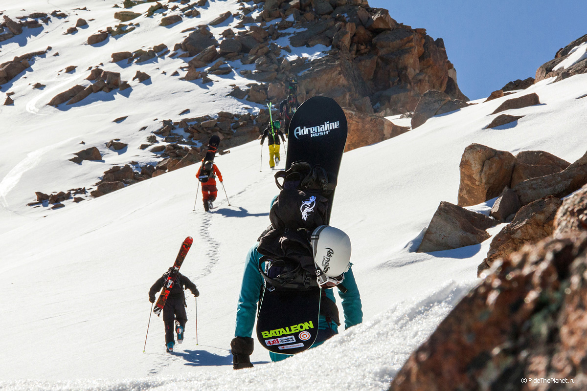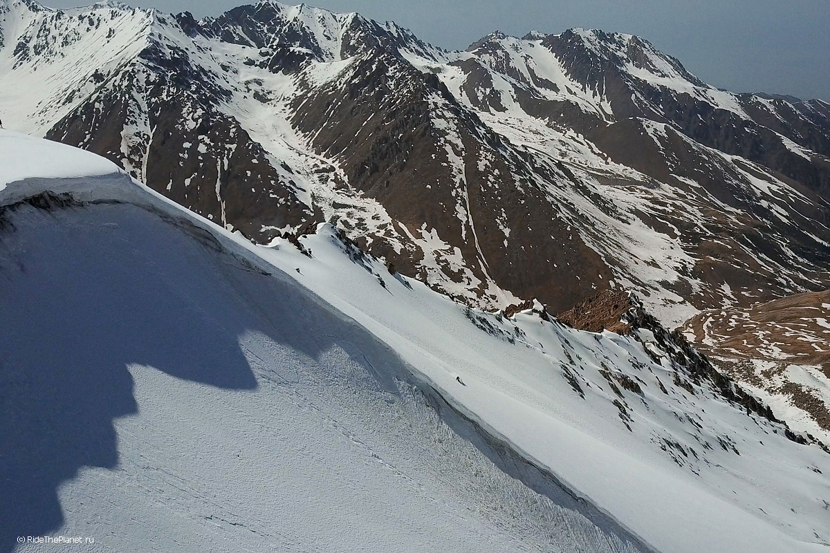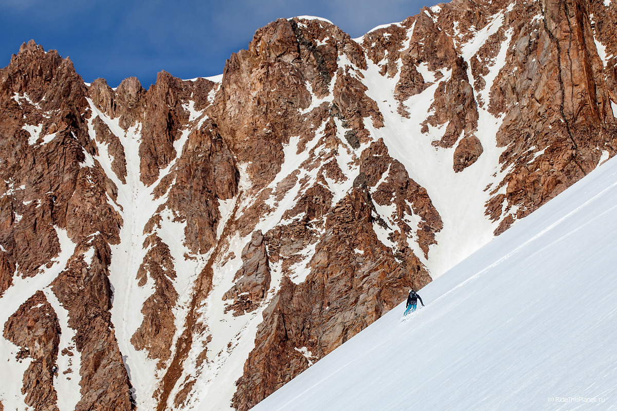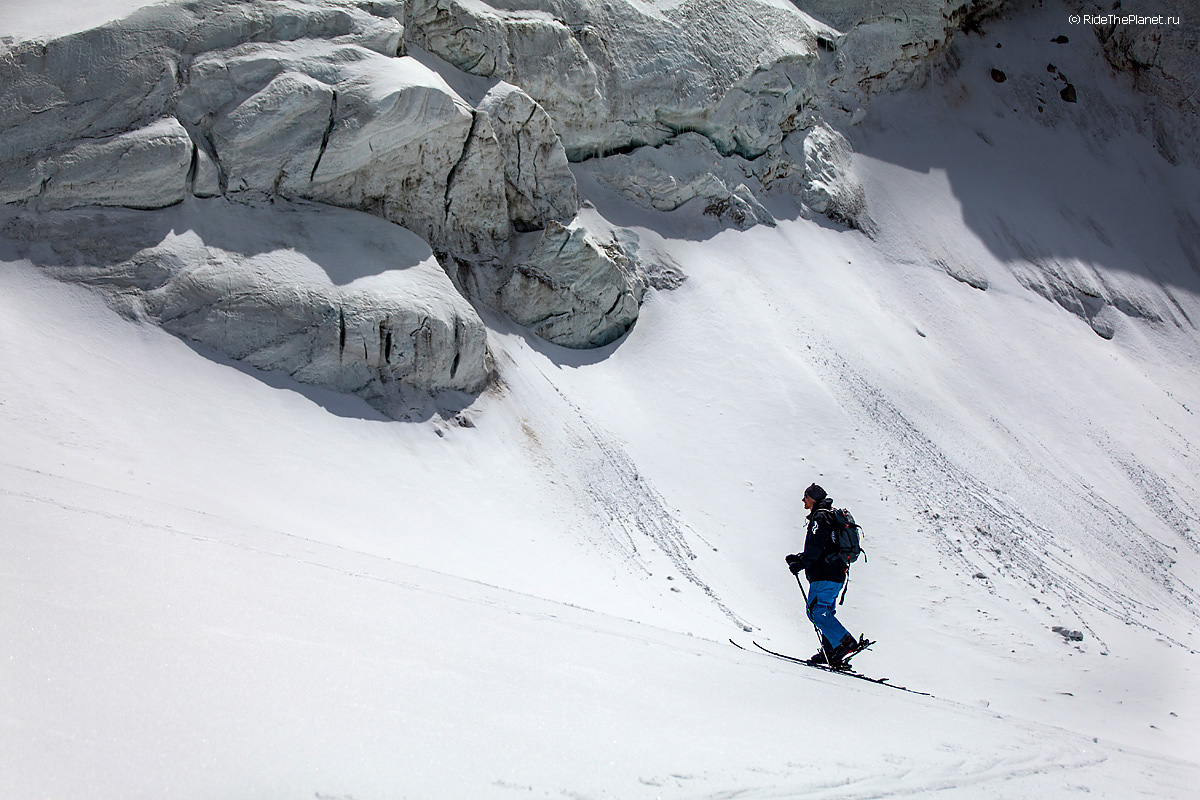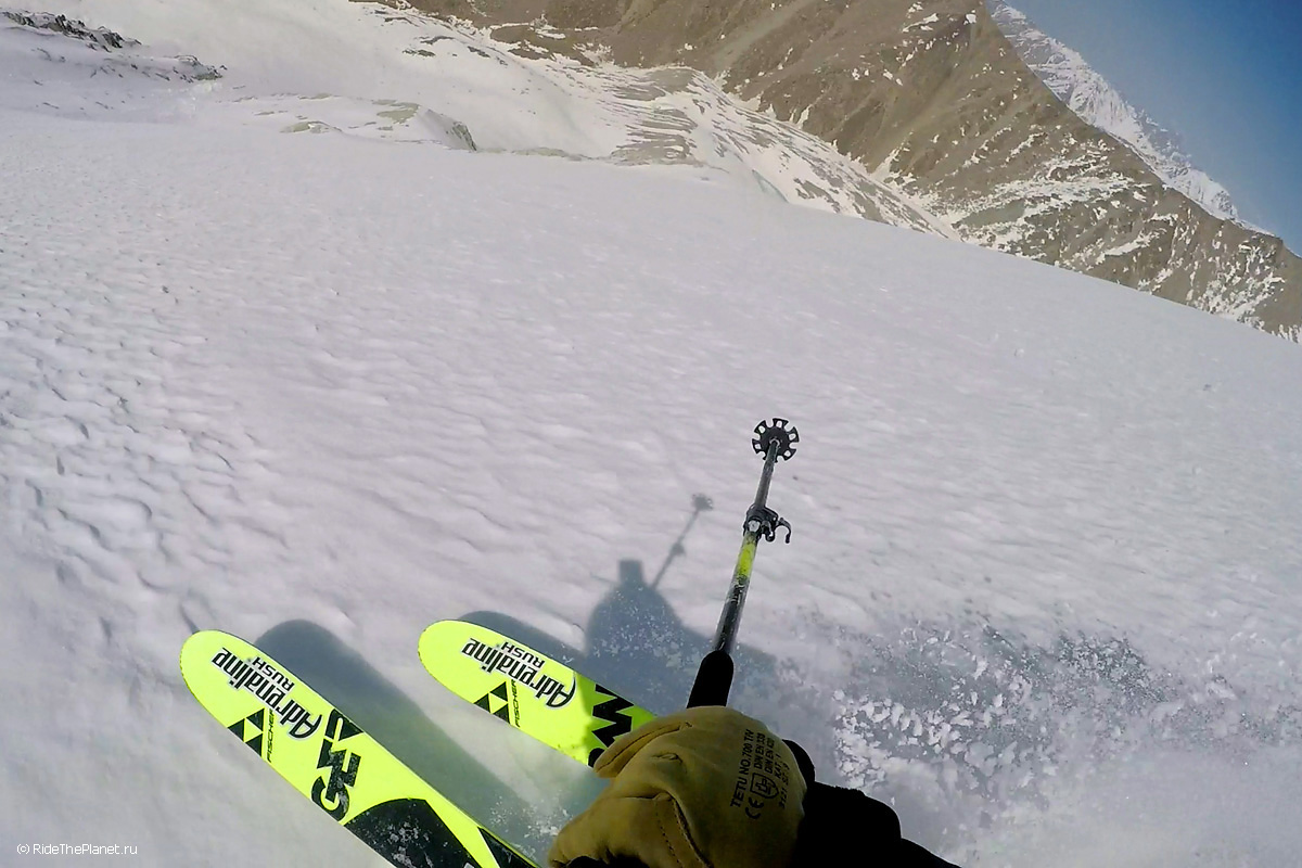 На следующий день мы отправились в горы с первыми лучами солнца. Поход по хребтам и скалам к точке нашего старта на вершине Карнизная занял почти 6 часов. Маршрут к старту проходил в основном по скальным гребням, поэтому использовать скитур было невозможно и пришлось целый день лазить по скалам в горнолыжных ботинках, пару раз переодеваться в треккинговую обувь и нести рюкзак с лыжами и ботинками весом 15-17 кг. Ходить по горам на высотах в районе 4000 метров довольно тяжело, если подумать, то мало где в мире вообще катаются фрирайд на таких высотах – и это уже гораздо ближе к ски-альпинизму. Например в итальянской Аосте, где я много живу и тренируюсь в последние годы, это соответствует спуску с вершины Гран Парадизо.
