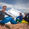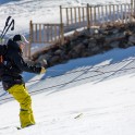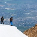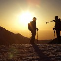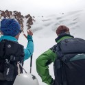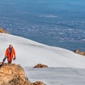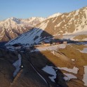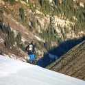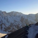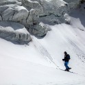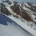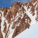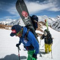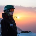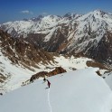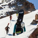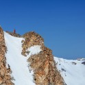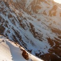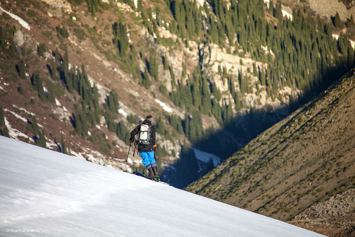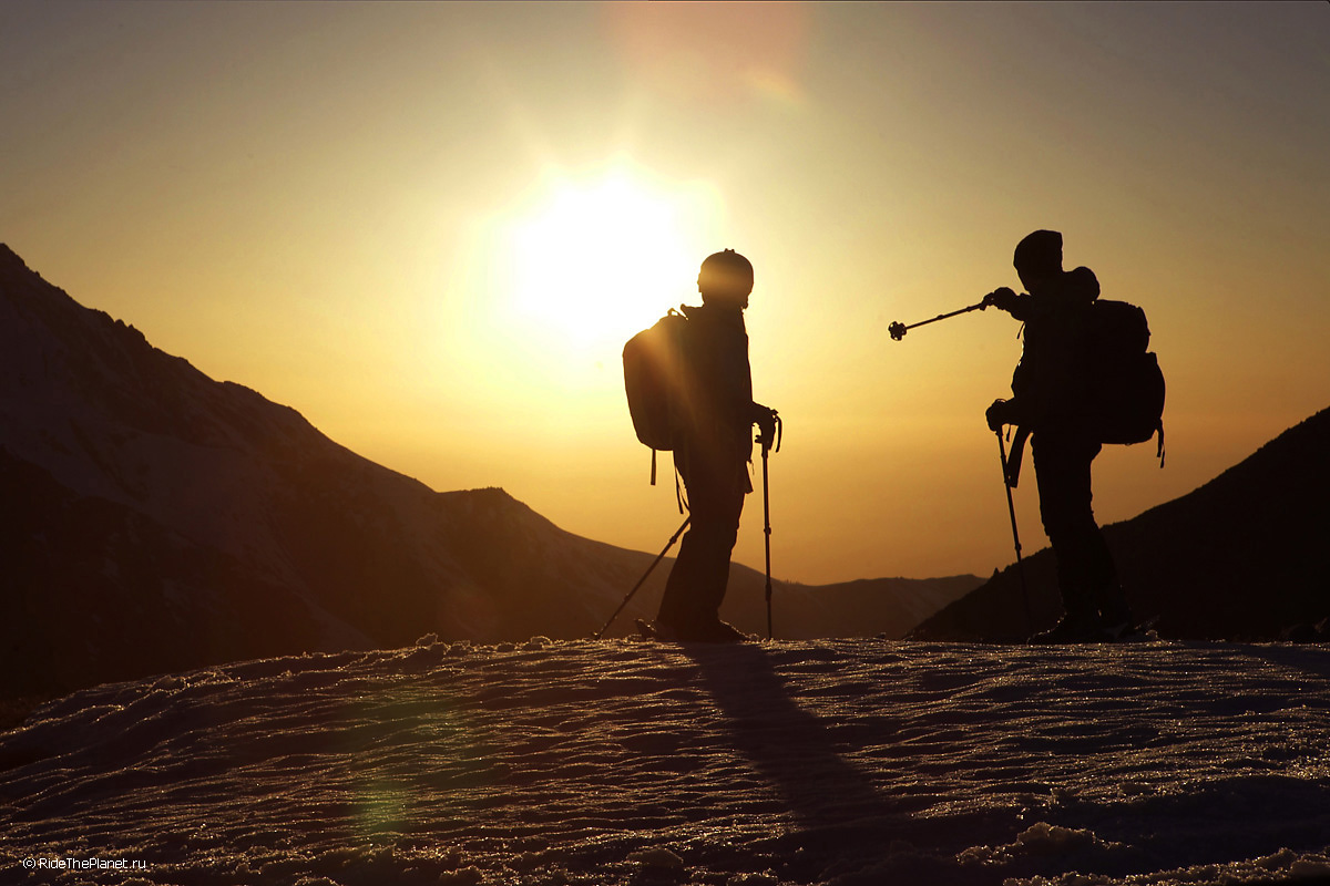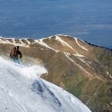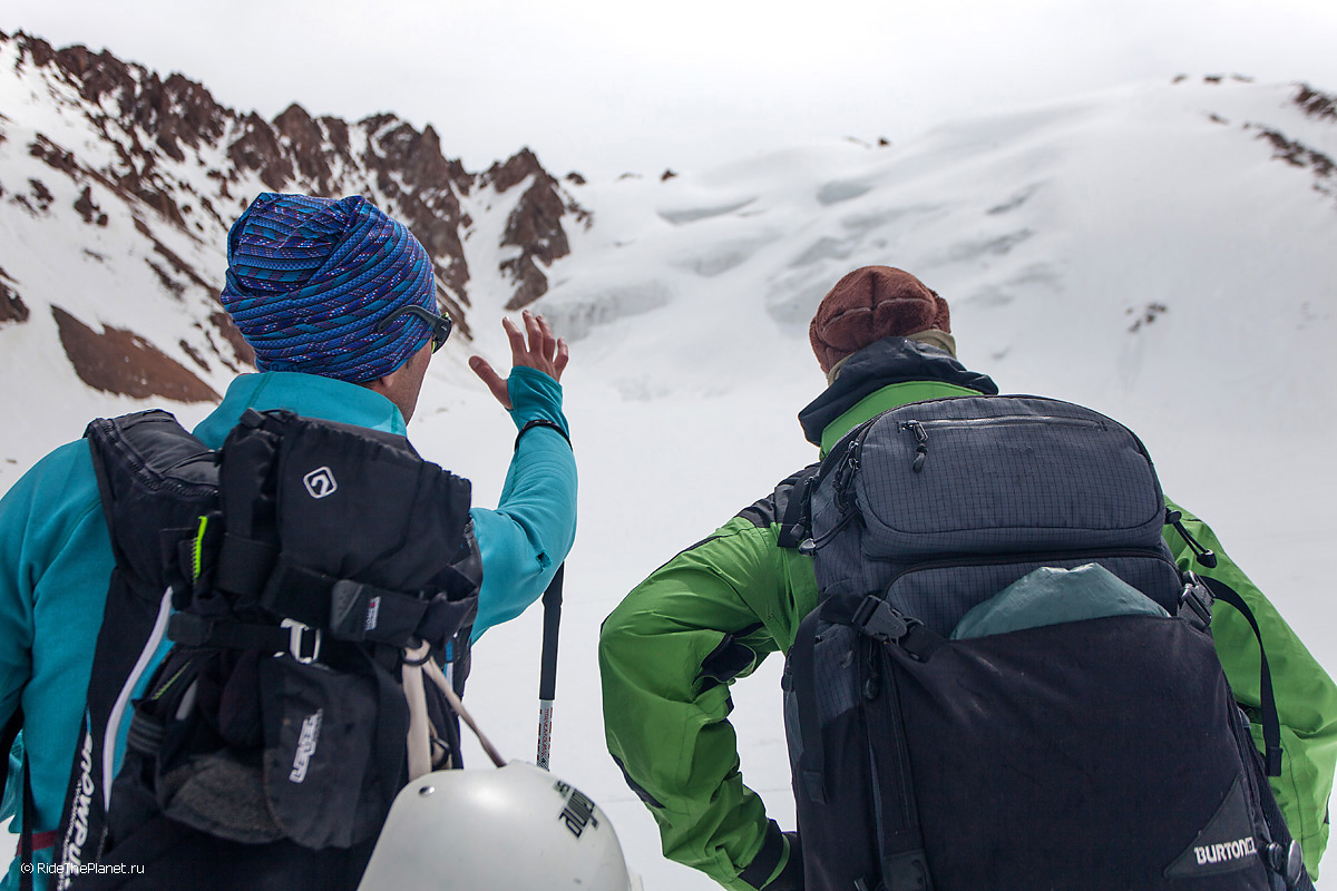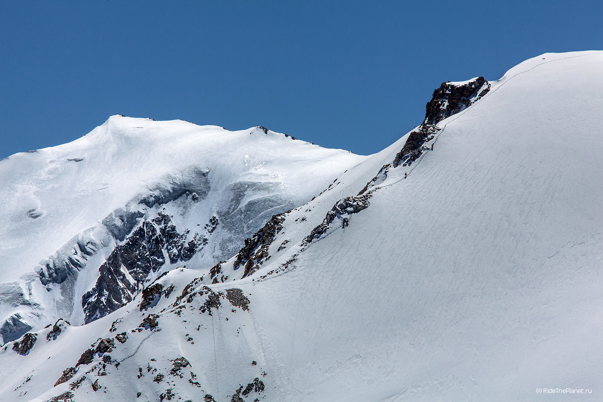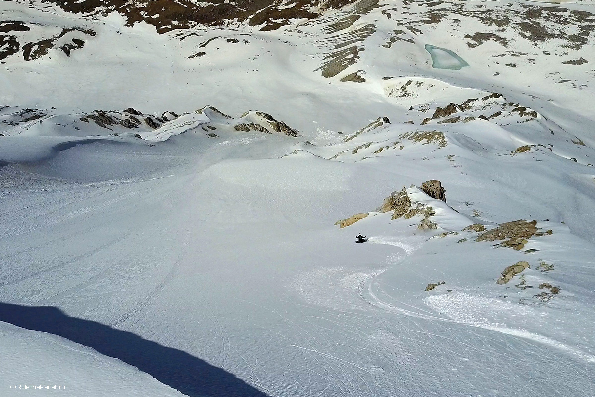 На следующий день мы отправились в горы с первыми лучами солнца. Поход по хребтам и скалам к точке нашего старта на вершине Карнизная занял почти 6 часов. Маршрут к старту проходил в основном по скальным гребням, поэтому использовать скитур было невозможно и пришлось целый день лазить по скалам в горнолыжных ботинках, пару раз переодеваться в треккинговую обувь и нести рюкзак с лыжами и ботинками весом 15-17 кг. Ходить по горам на высотах в районе 4000 метров довольно тяжело, если подумать, то мало где в мире вообще катаются фрирайд на таких высотах – и это уже гораздо ближе к ски-альпинизму. Например в итальянской Аосте, где я много живу и тренируюсь в последние годы, это соответствует спуску с вершины Гран Парадизо.