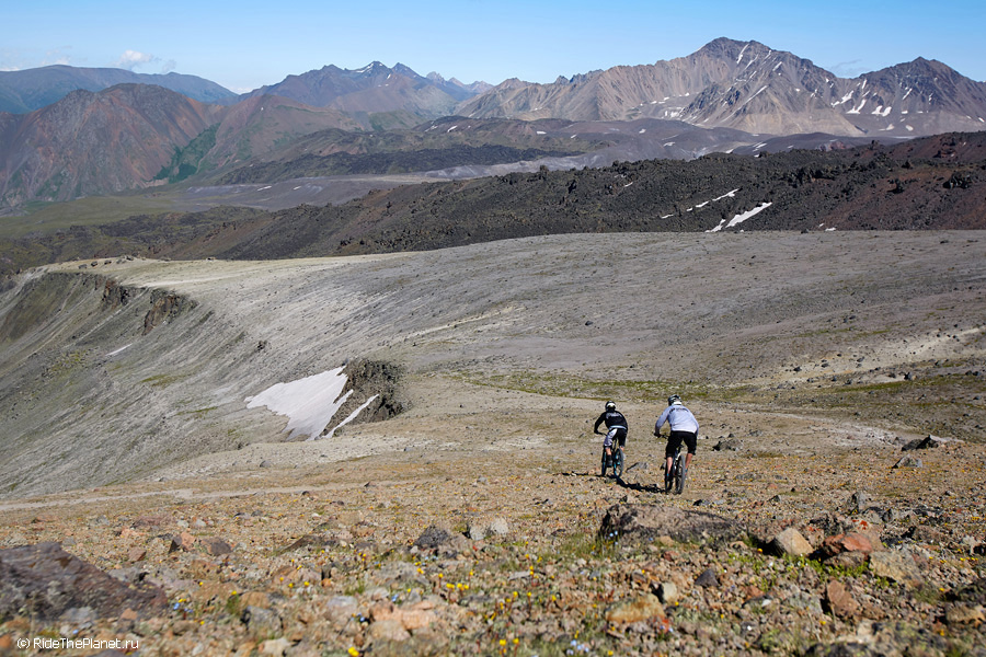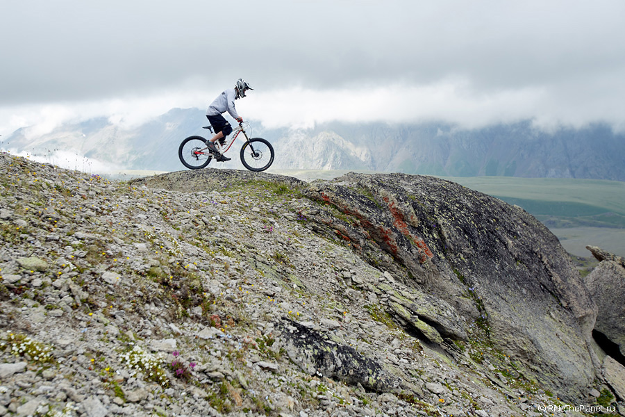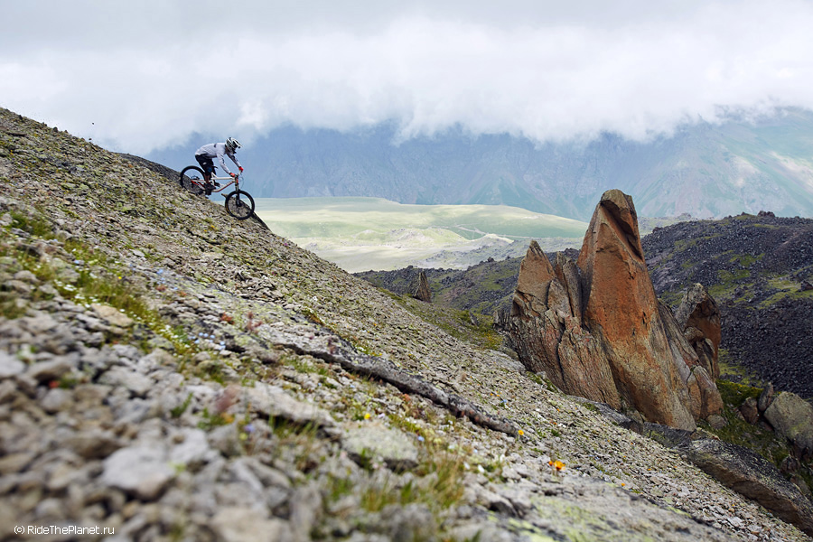 Мне очень понравилось кататься на северной стороне Эльбруса, там нашлось много замечательных рельефов для катания на велосипеде – склоны с большими уклонами и отсутствием растительности, кулуары, скалистые и песчаные гребни, длинные и равномерные «сыпухи». И, конечно же, здесь очень красивые места – при катании на склонах Эльбруса на высоте более 3000 метров, нам открывались панорамы на множество долин и высокогорных скалистых плато.