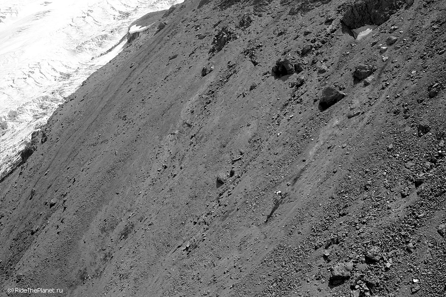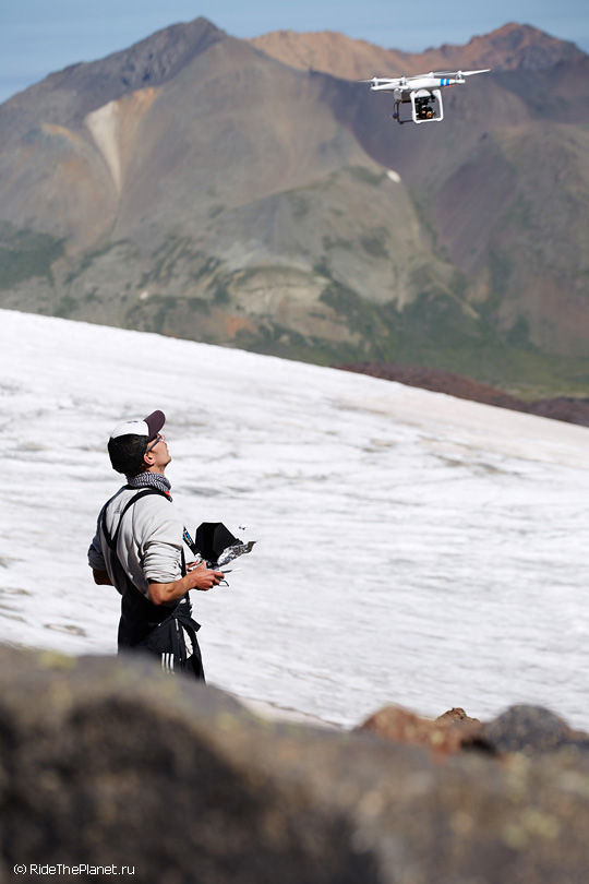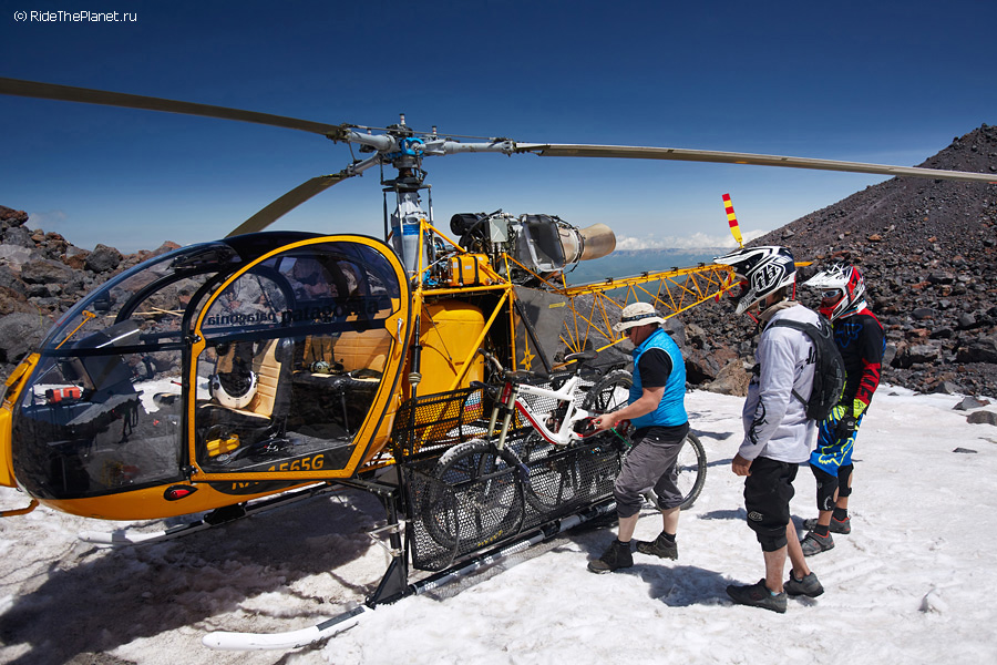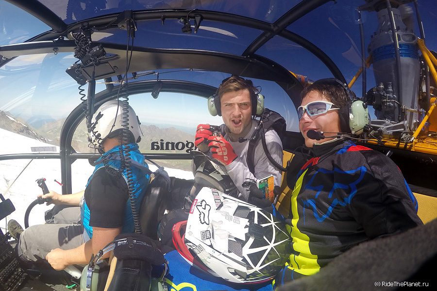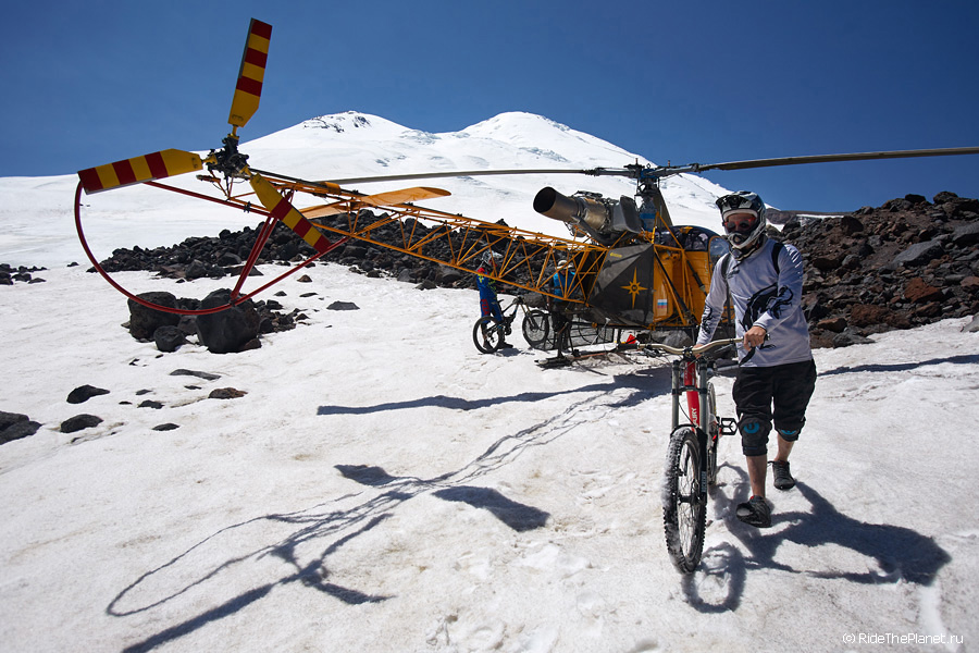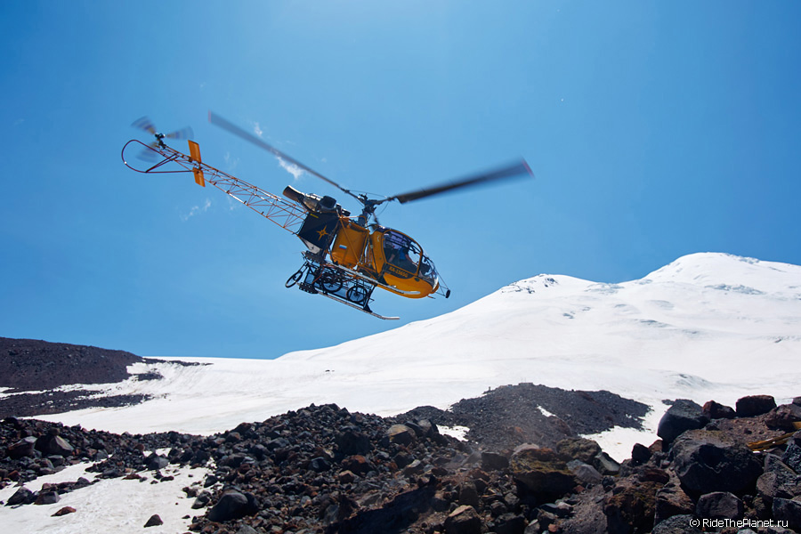 Один день мне запомнится на всю жизнь. Ясное морозное утро. С рассветом выдвинулись к верхнему базовому лагерю восходителей на Эльбрус на высоте 3800 метров. Здесь кончаются камни и начинается только лед и снег, базовый лагерь на моренном гребне со всех сторон окружен ледниками. Поднявшись в лагерь и отдыхая после непростого подъема с велосипедами, которые последние пару часов приходилось нести на себе по тропе и карабкаться по скалам, мы обсуждали варианты съемок, спусков по льду и скальным тропам. И услышали звук подлетающего вертолета! Это был вертолет Lama компании Heliaction с пилотом Сашей Давыдовым.