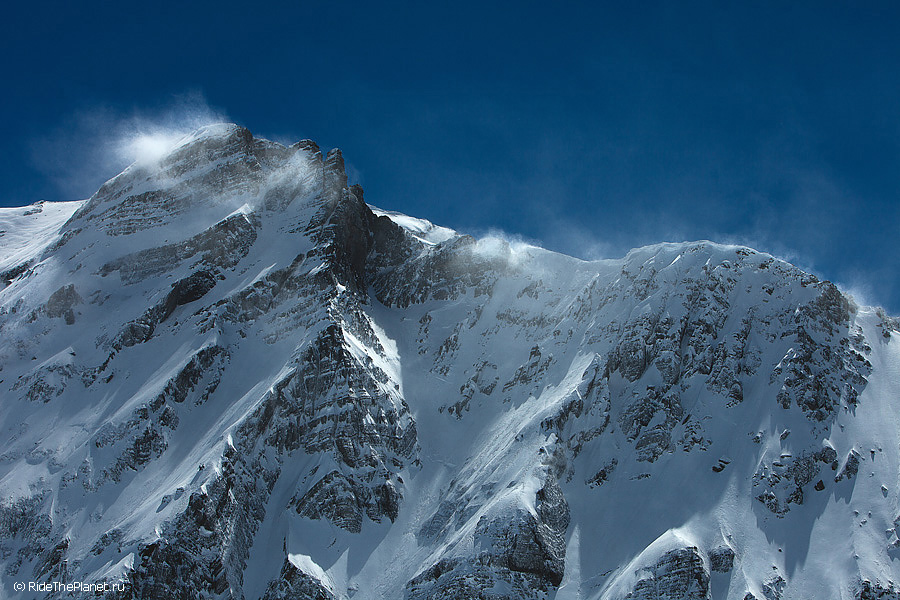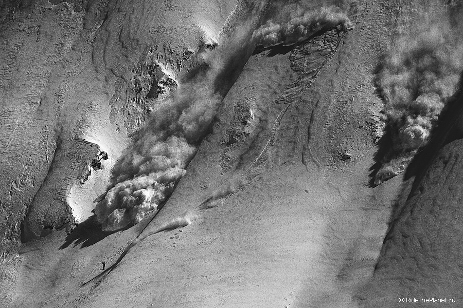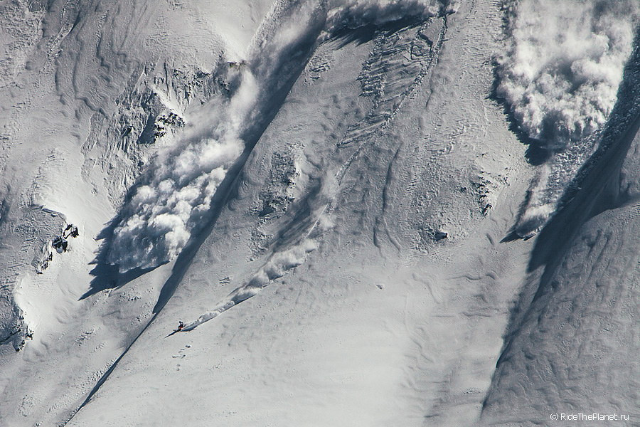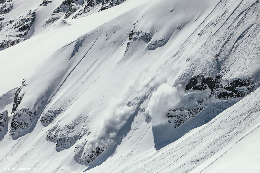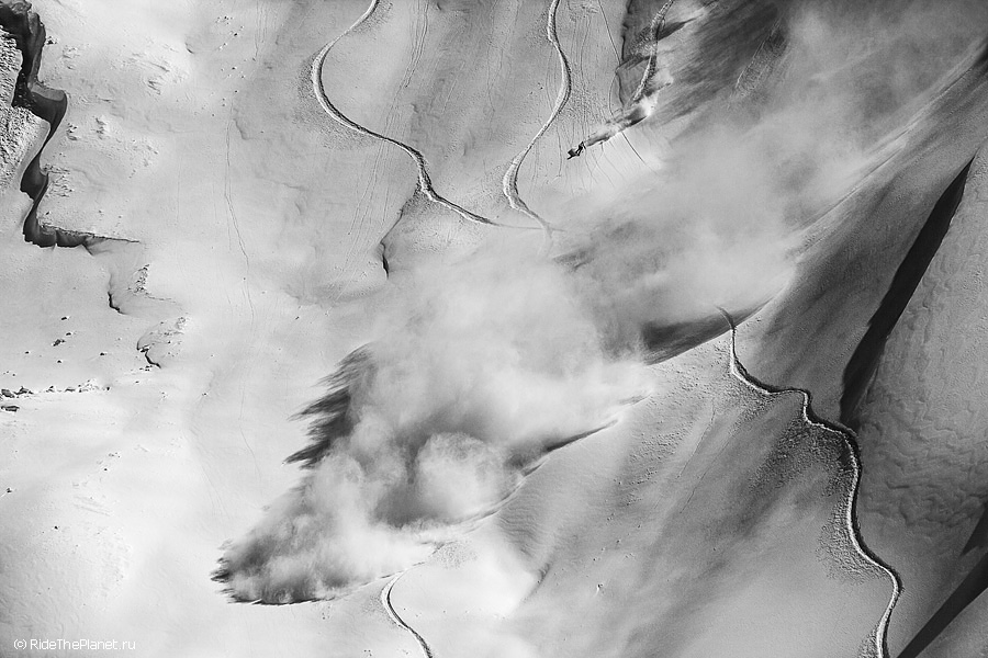 «В первый наш съемочный день, после обильного снегопада, снег оказался нереально пушистый – проваливаешься в лыжах по колено, а без них по пояс! И даже не верилось, что на календаре уже почти середина апреля. После снегопада все в команде довольно сильно нервничали из-за скрытых опасностей и лавинной обстановки при выборе склонов и линий спусков райдеров.»