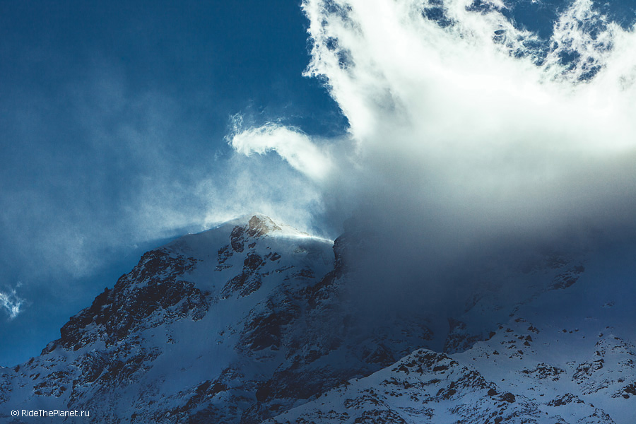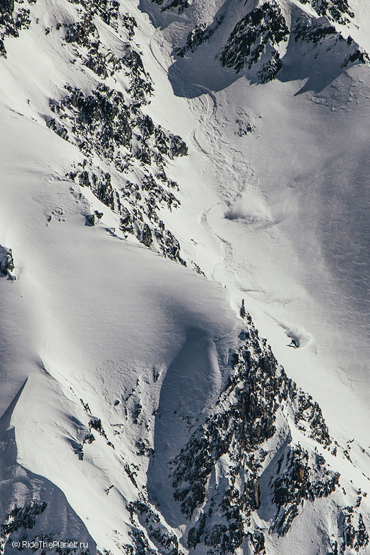 «В безветренный день, когда после заброски улетает вертолет и ты остаешься один на горе, в ушах начинает нереально звенеть от окружающей тишины. В одну из забросок на высоте около 3400 метров, мы всей командой около получаса ждали, когда разгонит легкую облачность и появится солнце – райдеры в одиночестве находились на гребне на старте, каждый в своем кулуаре, операторы в километре на склоне напротив. И в этот момент вокруг была какая-то особенная, обволакивающая, звенящая тишина. Такие моменты запоминаются надолго!»