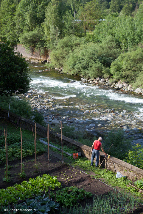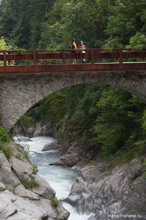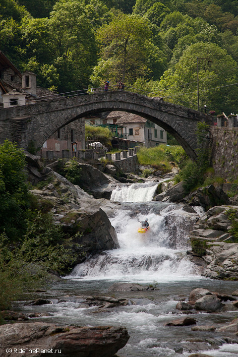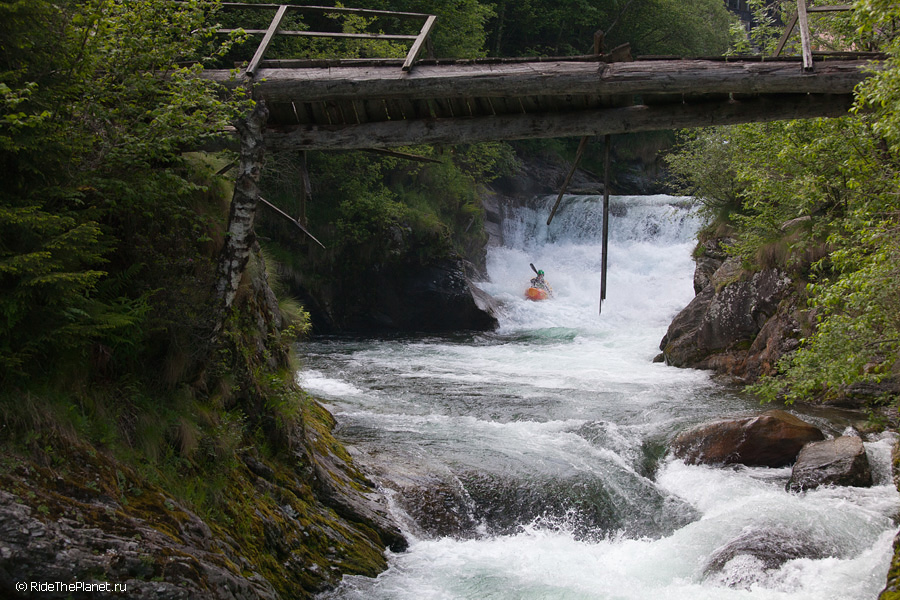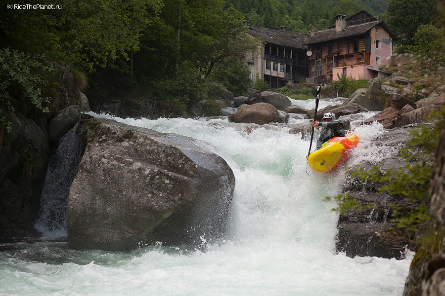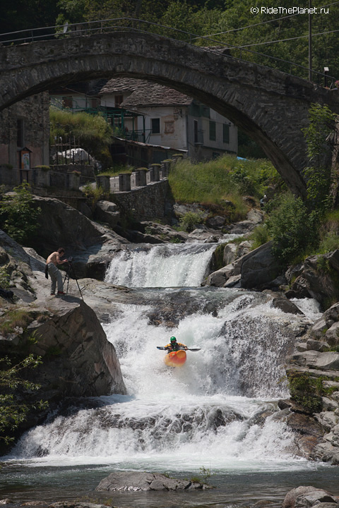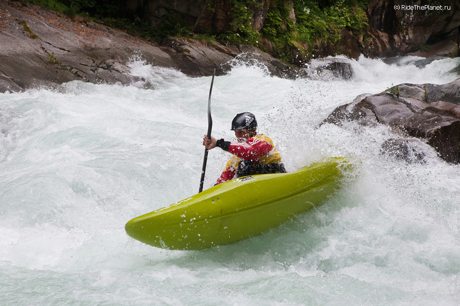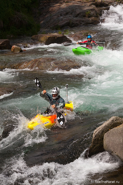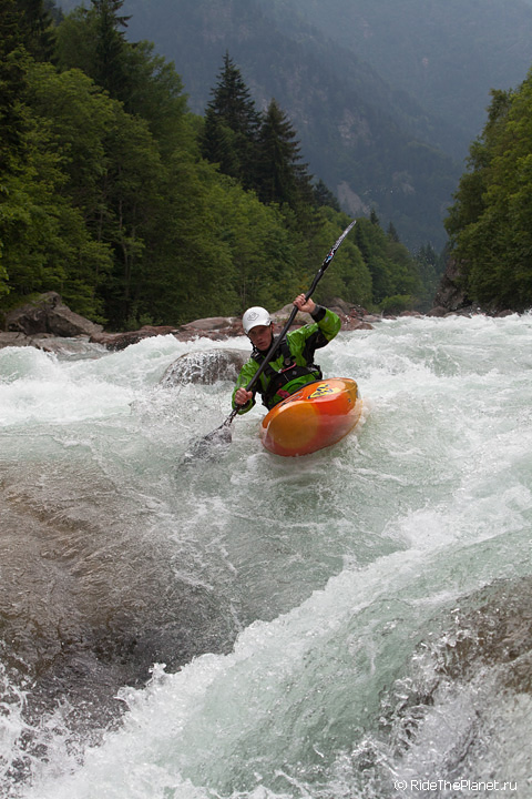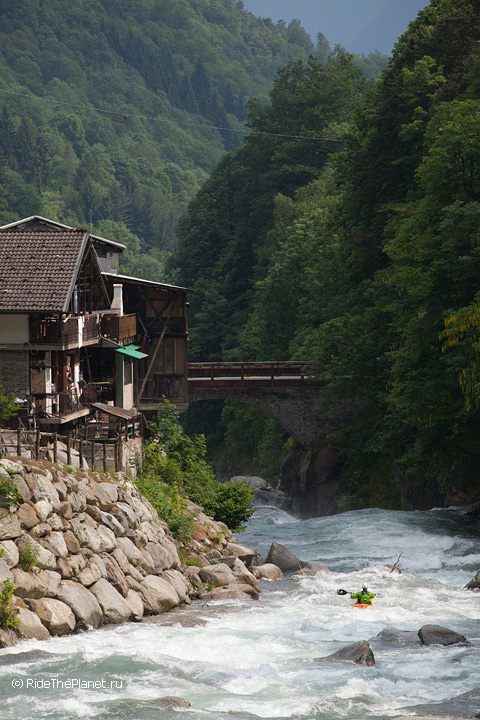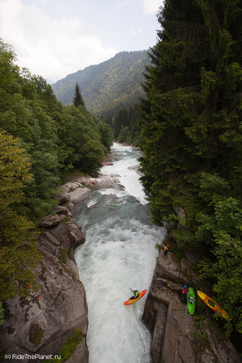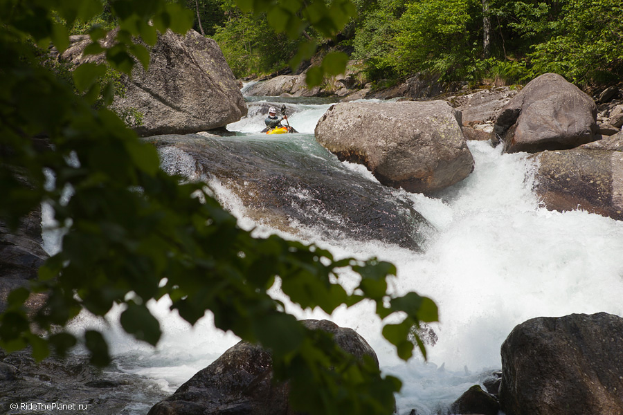 «Италия. Малорасходные реки. Довольно большое падение, много камней в русле. После большого перерыва — неплохая динамичная раскатка на координацию и внимание. Ни того, ни другого довольно сильно не хватает — слишком большой перерыв был, больше 6 месяцев без нормальной воды. Пока не могу сказать, что итальянские реки — это сказочный восторг, как я слышал от большинства сплавлявшихся тут друзей. С другой стороны, мы посмотрели пока всего лишь один регион, и то достаточно поверхностно. А может, нам немножко не хватает воды.