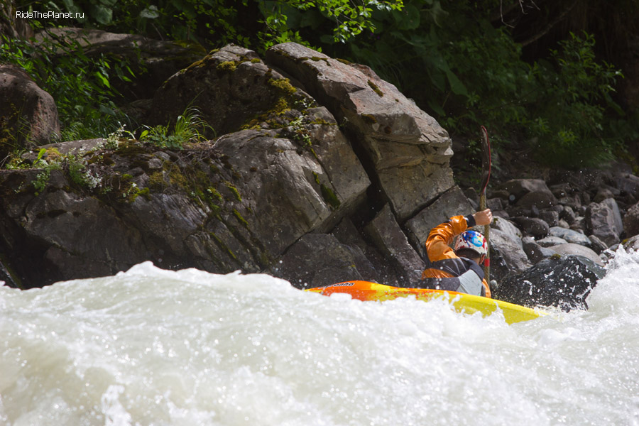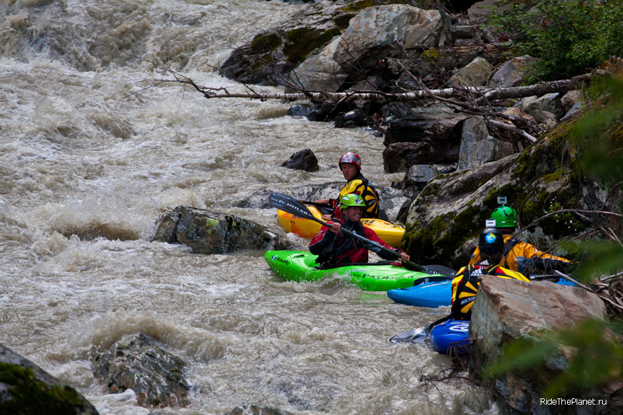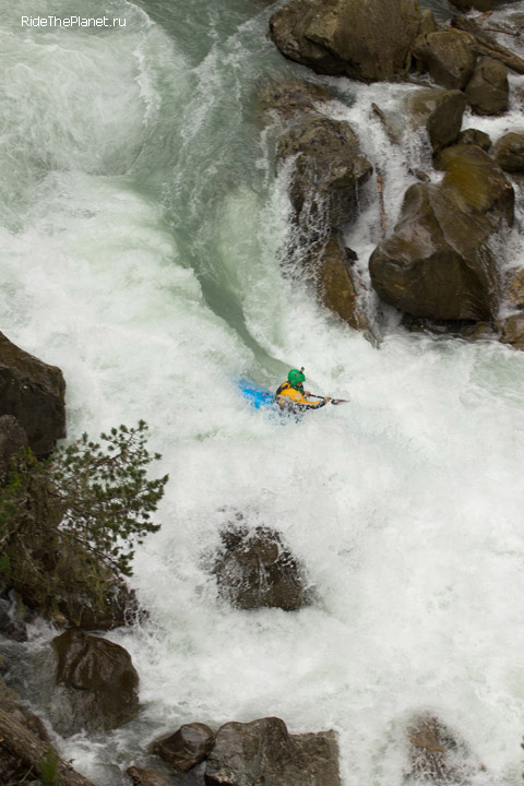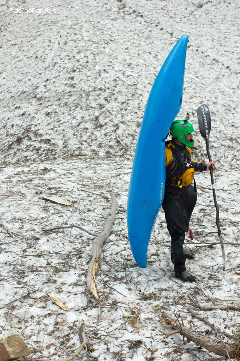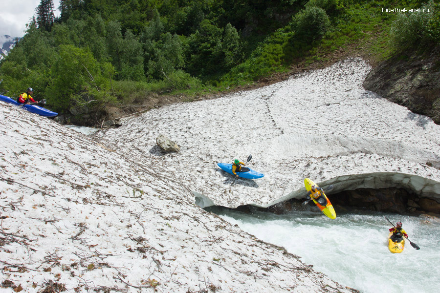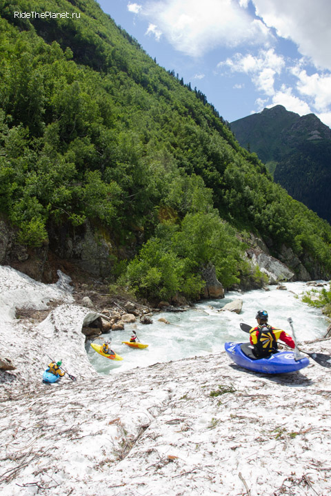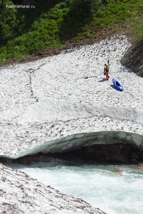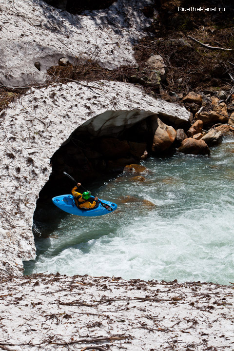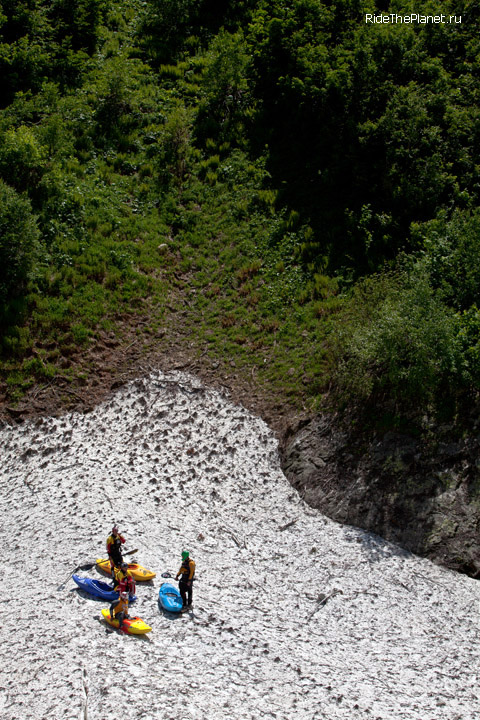 «Прибыв на место старта, — сообщает Дмитрий Данилов, — мы обнаружили, что река полностью перекрыта сошедшей со склона лавиной, проплыть под которой не представлялось возможным. Однако это не помешало начать сплав, а даже сделало его более веселым — райдеры стартовали прямо с лавины, по пути накручивая «спины» и прыгая сразу в начало основного порога на всем сплавном участке».